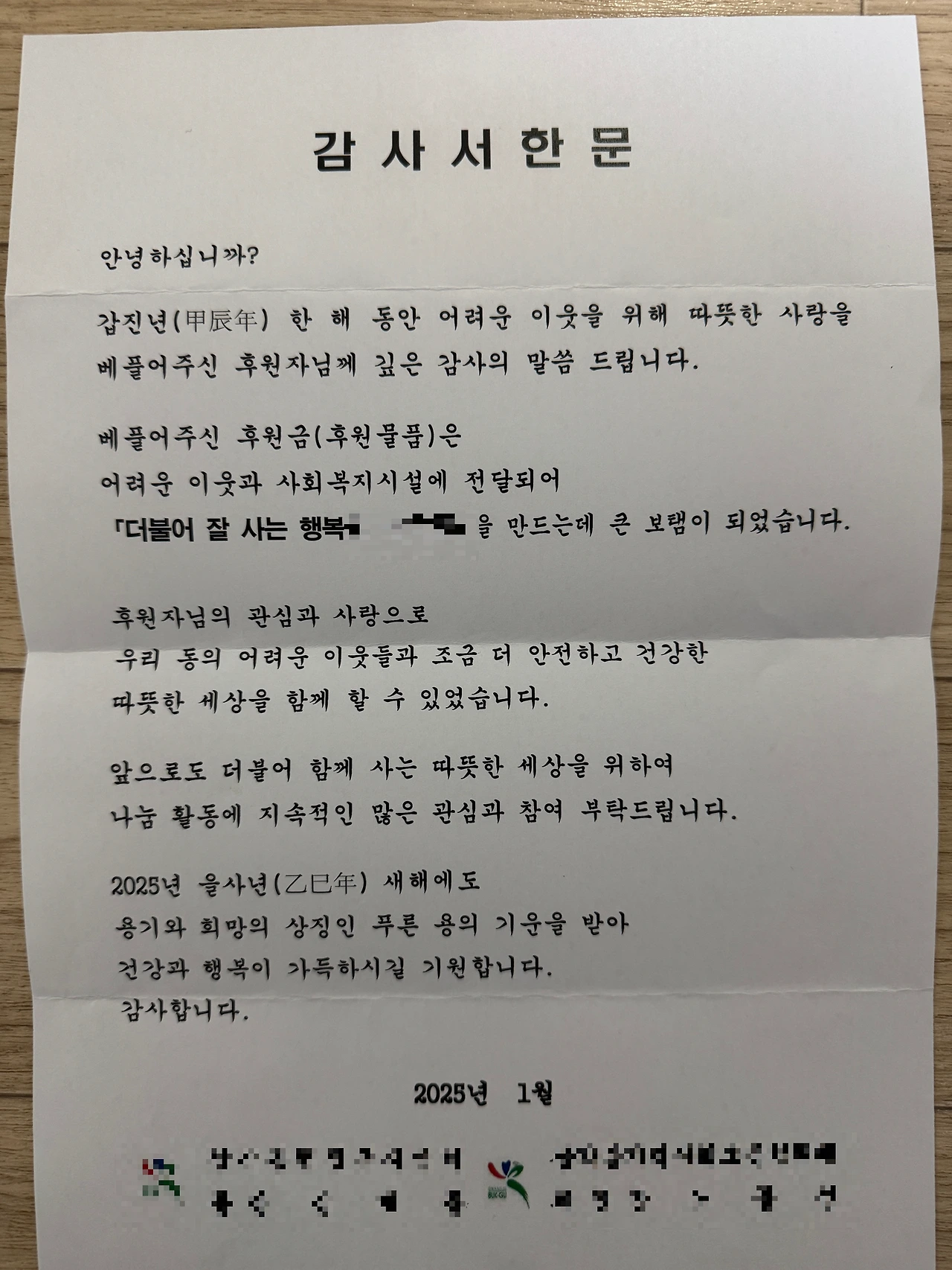 독자분들의 도움으로 시작된 기부 덕분에 동내 행정 복지센터에서 감사 서한문도 받아보았다