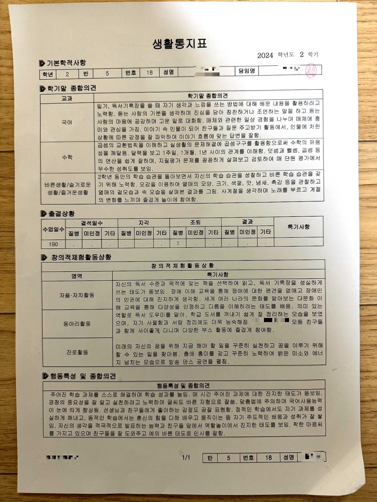 딸랑구의 방학식과 동시에 가정통지표가 집으로 도착하였다. 문제는 이직을 한 지 1년이 거의 다 되는 시점이 되어서야 직원들 충원이 마무리가 되는 통에 너무 바빠서 통지표를 보지도 못했다는 것이다.