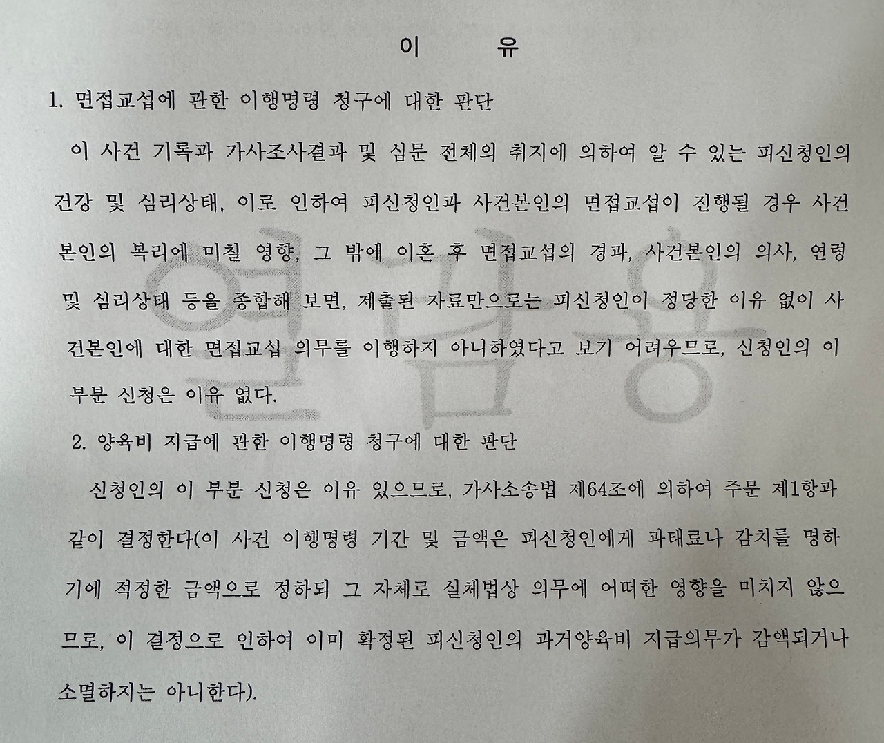 이로서 확인할 수 있는 것은 비양육자가 면접교섭을 하지 않는다면 그것을 강제할 수 없다였습니다 양육자가 비양육자에게 아이를 보여주지 않는 것은 강제할 수 있는데 반대의 경우에는 그렇지 못한 게 참 의아할 따름입니다