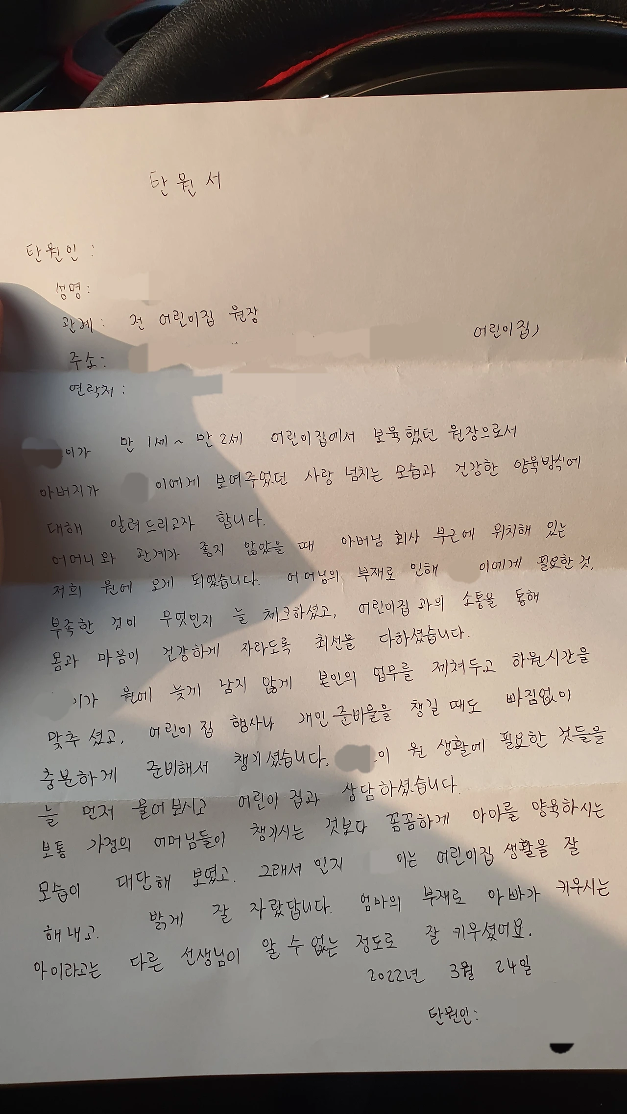 "제가 양육자로써 엄마보다 더 나은 사람인지 그리고 아이한테 어떤 사람인지 적어주시면 될 거 같아요. 원장님이 보셨을 때 말이에요"