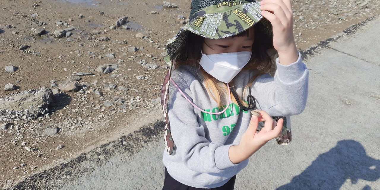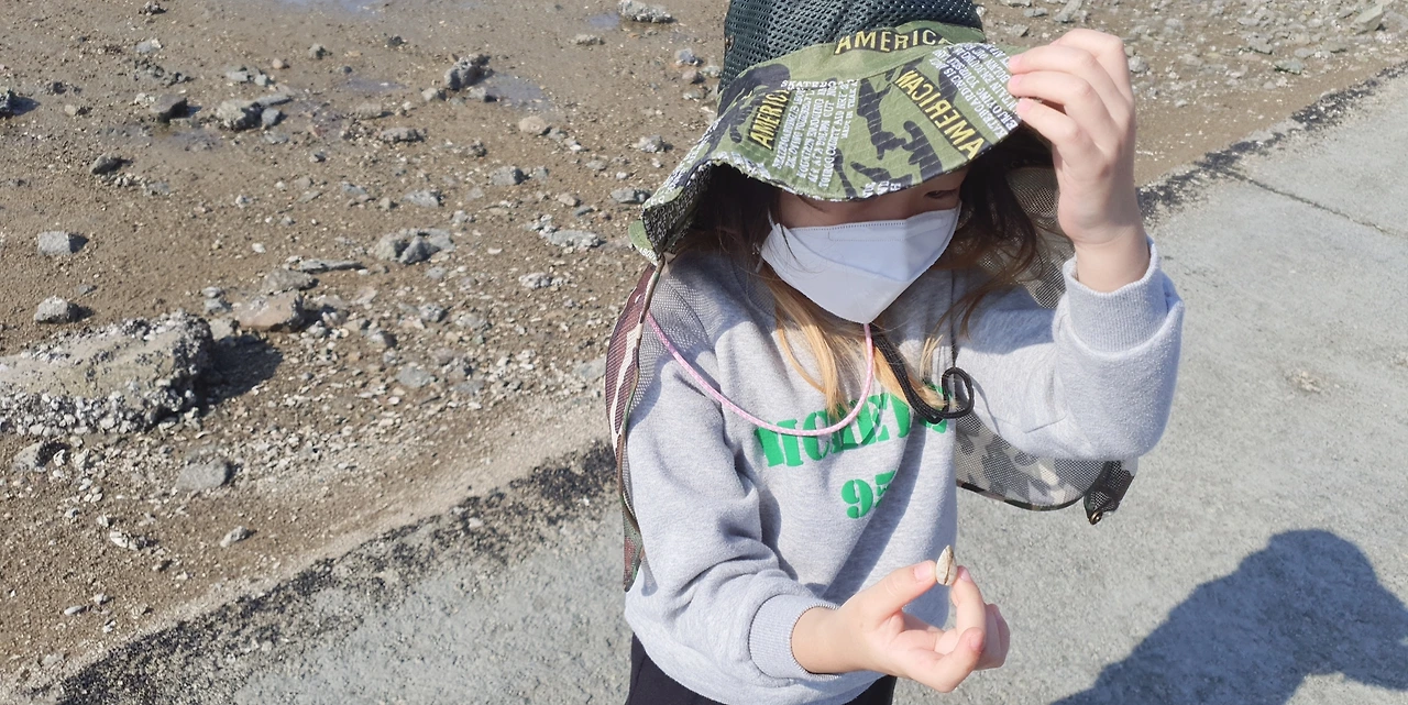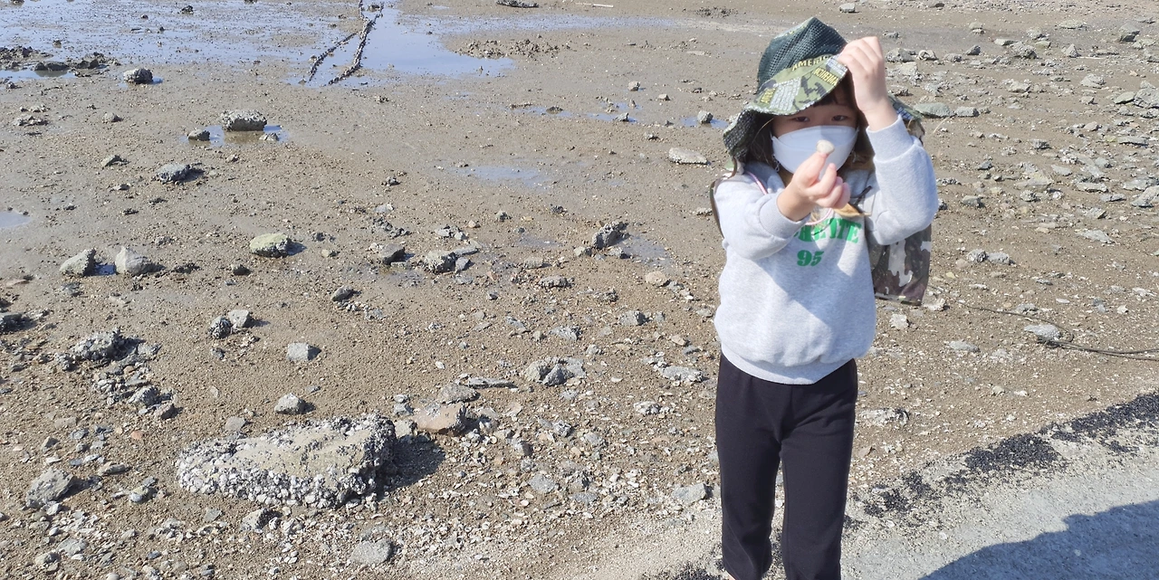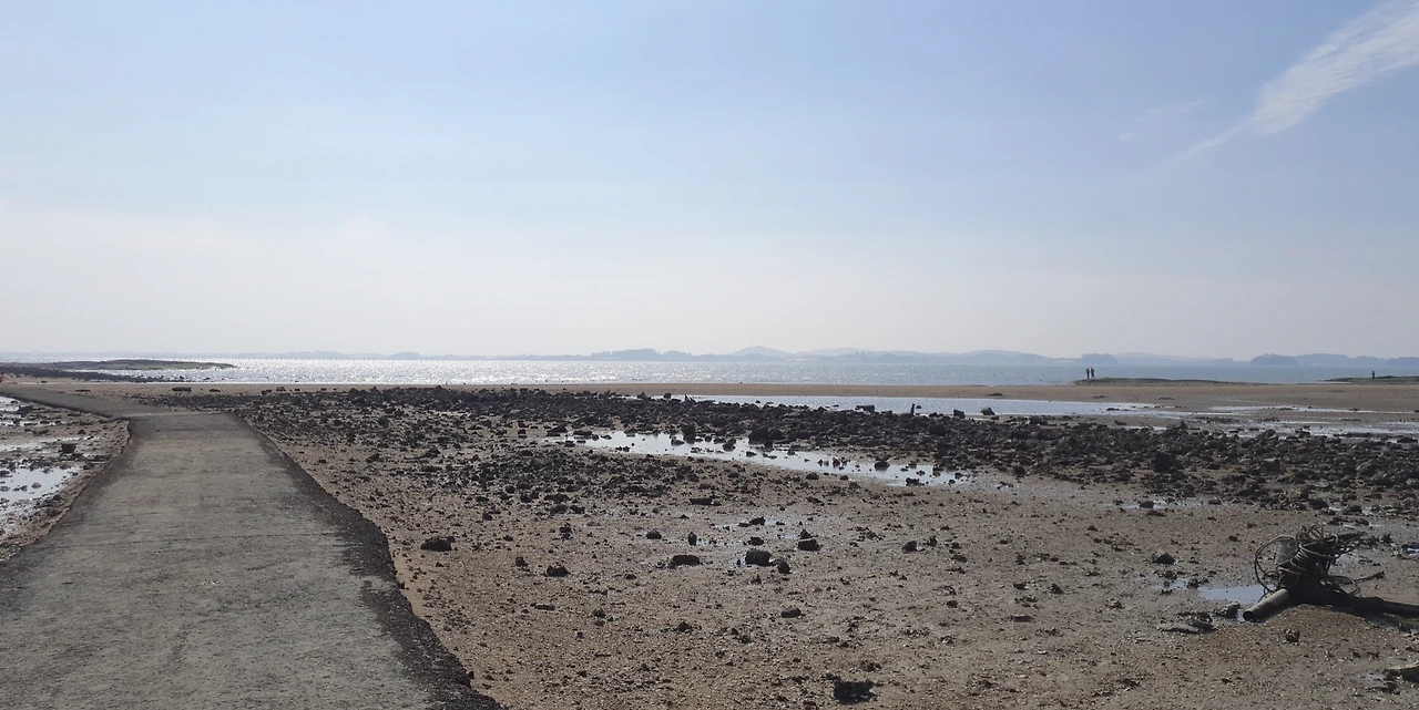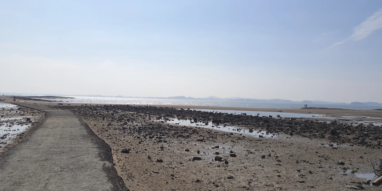 바다에 도착한다 갯벌이 넓게 펼쳐져 있는데 사람들이 장화를 신고 뻘을 돌아다니며 물웅덩이를 살핀다 낚시를 하시는 분도 보이고, 뭔가를 캐는 분들도 보여서 아이랑 같이 얼른 모자를 눌러쓰고 후다닥 뛰어간다, 펄위에 신기하게도 시멘트로 길이 만들어져 있다 사람들이 많이 와서 그런 건지 섬까지 썰물 때 길을 만들려고 하는 건지 아이와 펄 위에 있는 조개 같은걸 주워본다