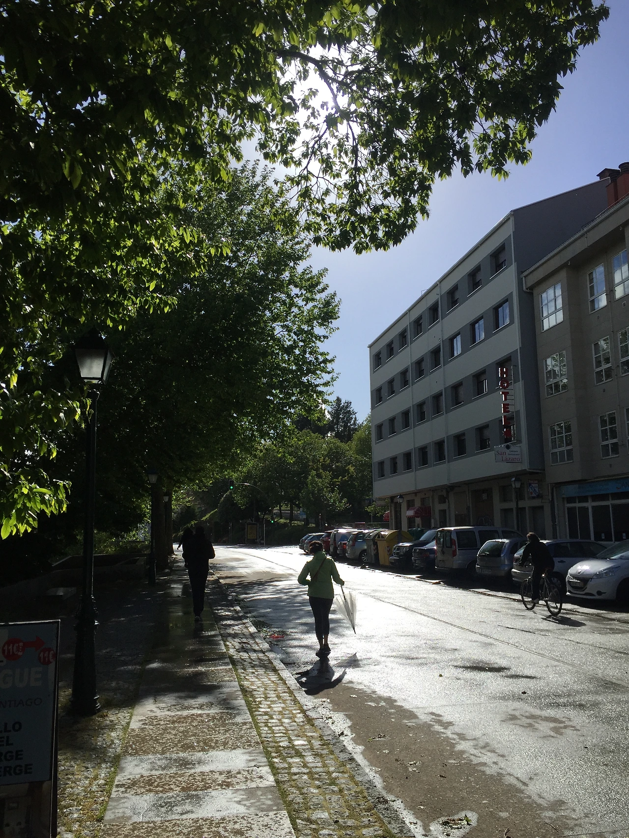 사실 그런 고민을 할 정신상태가 아니었다. 남아있는 정신력을 끌어 모아 어떻게든 도착할 생각뿐이었다. 내 다리가 내 다리가 아니여... 하고 거의 기계적으로 움직일 때쯤, 비로소 산티아고 도시 초입을 알리는 표지판이 나타났다. 이제 다 왔다. 살았다. 하지만 끝날 때까지 끝난 게 아니라는 교훈을 몸소 배워 알고 있었다. 도시 초입부터 대성당까지도 거리가 꽤 남아있으니 긴장의 끈을 놓지 말자. 때마침 고생한 순례자 둘을 축복하기라도 하듯 하늘도 빼꼼 맑은 빛을 허락해 주었다. 햇살 한 줄기에 고단한 마음이 녹아내린다.