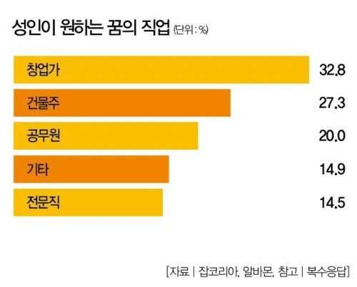 열 명중에 여섯 명은 창업주와 건물주, 두 명은 은퇴 후의 막강한 연금을 지급하는 공무원을 이상적인 꿈으로 원하고 있네요. 현재 고된 노동에서 벗어나고 싶은 바람이겠죠. 경제적 자유를 다룬 책과 메신저 사업이 서점과 SNS를 휩쓸고 있는 지금 현상들이 이와 무관하지 않을 겁니다.