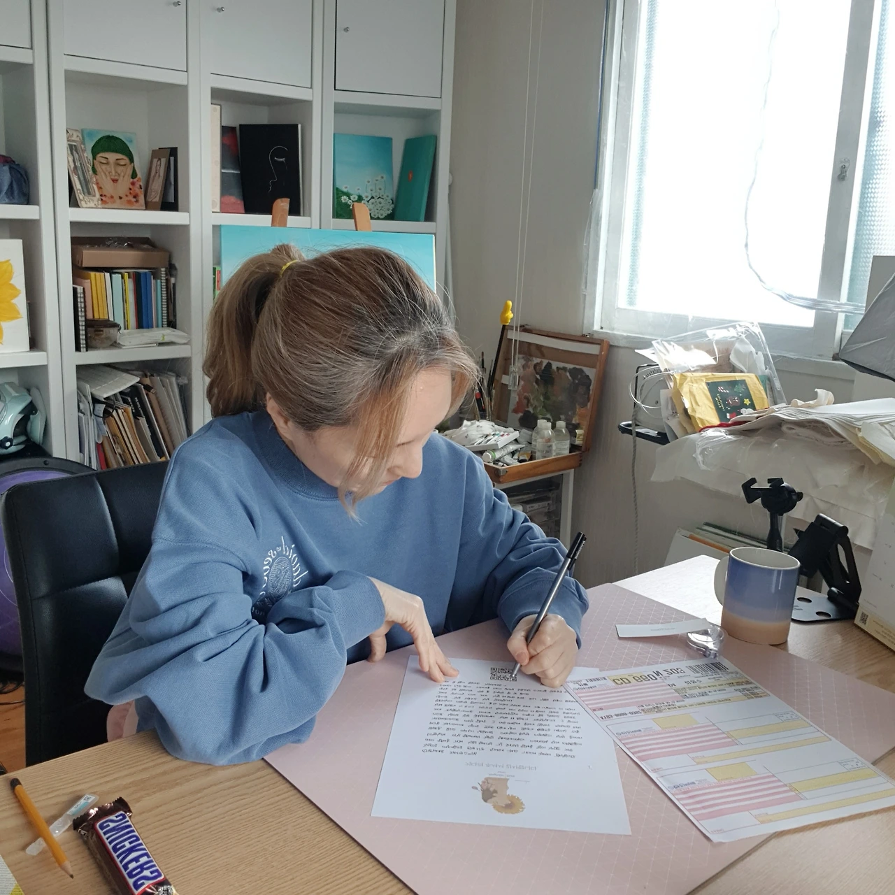 작업실에서 싱귤러한 제품을 구매하신 고객에게 감사편지 쓰고 있는 중이에요.