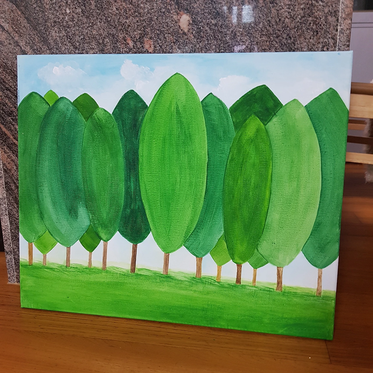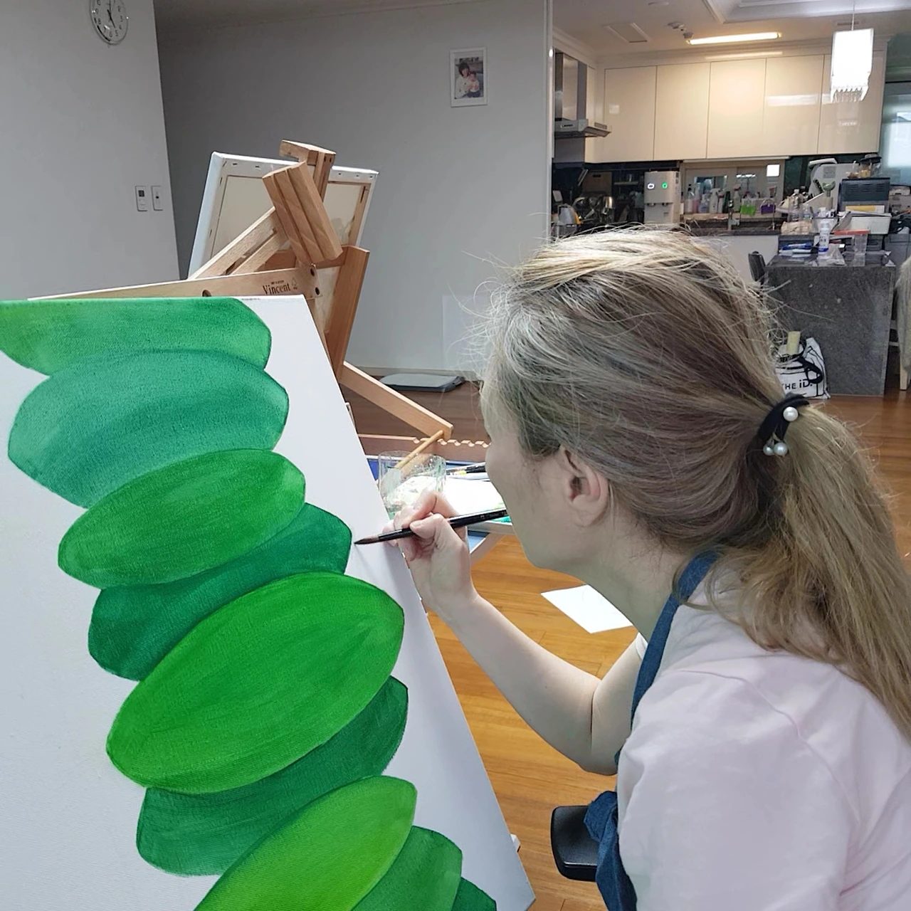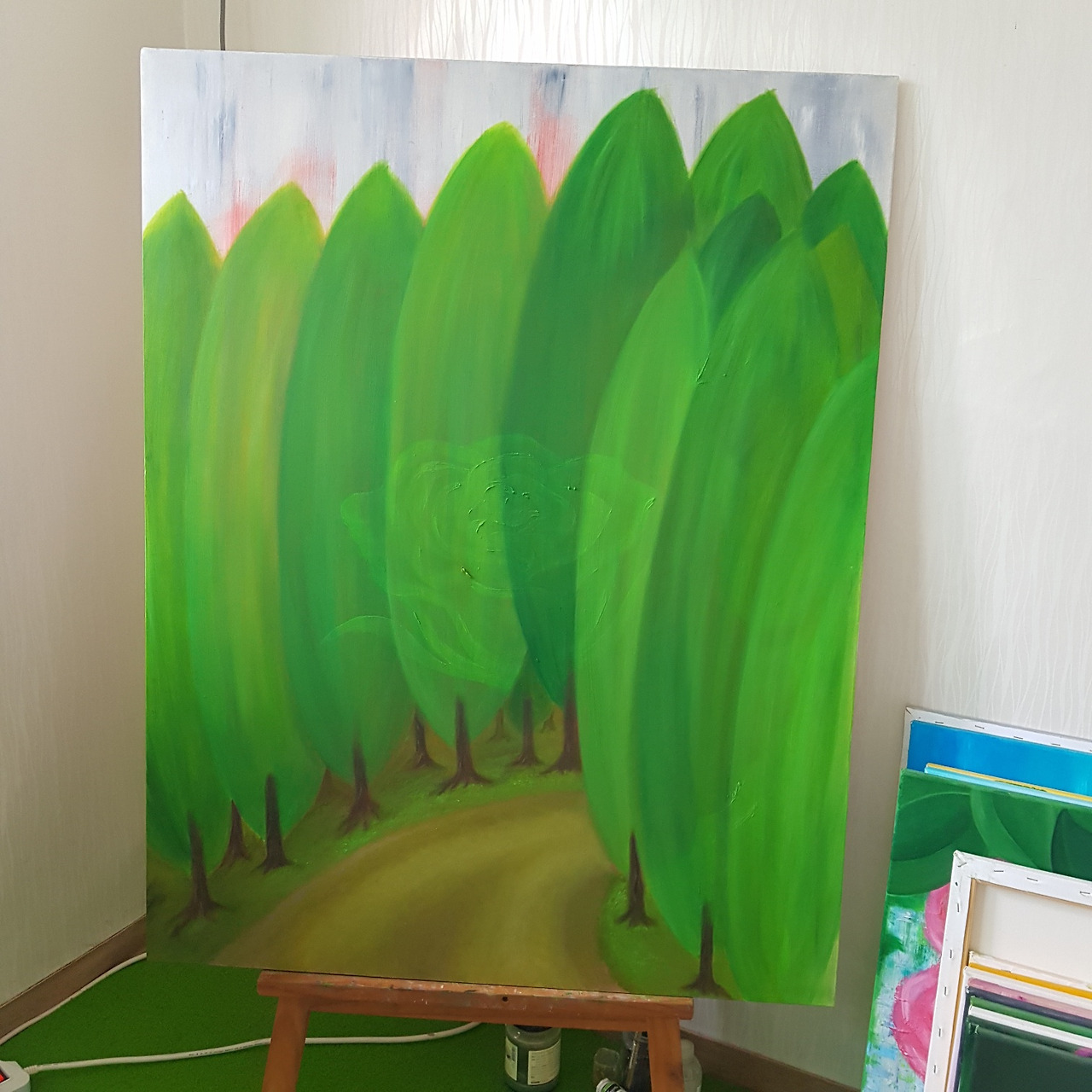 초록색은 컬러테라피에서 마음을 평온하게 해 주는 칼라라고 합니다. 컬러리스트 기사 자격증을 따 놓고도 제대로 사용을 해 보지 못해서 좀 더 공부를 해야겠다는 결심만 하지만, 제 그림에는 충실하게 칼라테라피 효과를 주고 싶어 다양한 그린컬러로 그림을 그려봅니다. 아침에 일어나서 눈 뜨자마자 마주하는 그림으로 평온한 하루가 될 수 있게 침대 맞은편에 걸어봤습니다.
