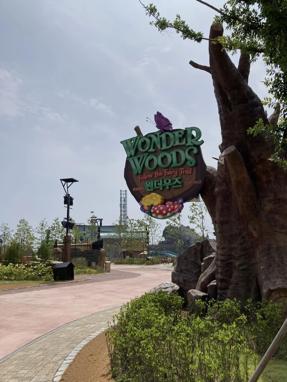 용기를 주는 샘물까지 찾았으니, 다음에 이동할 테마존은 바로 원더우즈(Wonder Woods)다. 부제를 보면 요정들의 숲을 따라가라는데, 이곳의 메인 어트랙션인 자이언트 스플래쉬 어트랙션을 비롯한 전체 테마구역의 디자인과 분위기와는 사뭇 대조되는 사인물 디자인이라고 생각한다.