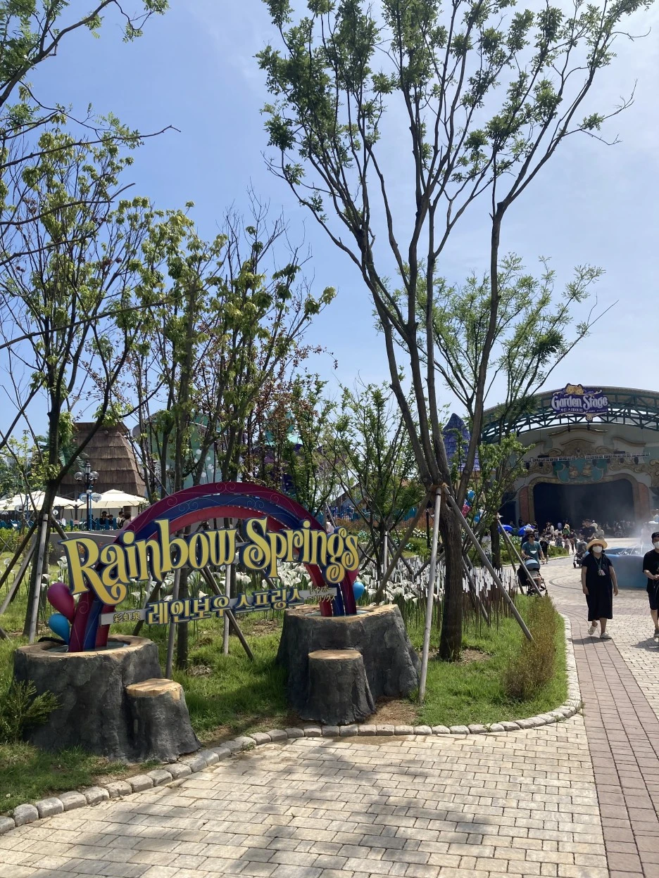 다음으로 이동할 테마존은 레인보우 스프링스(Rainbow Springs)이다. 회전그네 어트랙션과 롯데월드 어드벤처 부산의 메인 엔터테인먼트 시설인 가든 스테이지, 사진은 없지만 콩나무로 둘러쌓인 건물 내부에 로티의 키즈토리아(Lotty's Kidstoria) 등의 실내형 시설들이 위치한 곳이다. 레인보우 스프링스 테마존은 스토리 설정 상 모험가 로티가 용기를 주는 샘물을 찾아야 하는 곳으로 거대한 콩나무와 마법의 샘물이 분출되는 곳이다.