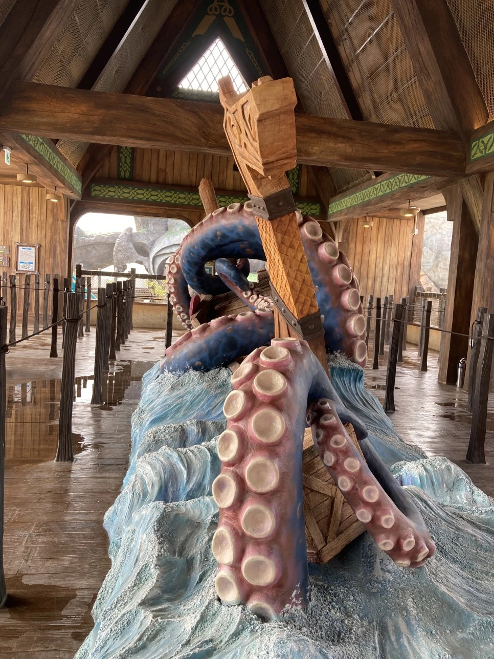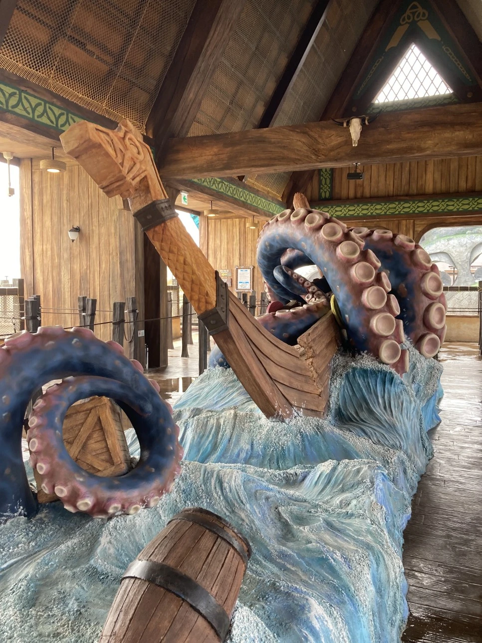 자이언트 스플래쉬의 또다른 초기 컨셉아트를 보면 거대한 크라켄 형태의 괴수가 보트를 잡아먹는 것이 표현되어 있는데 아마 예산 때문에 대기줄의 조형물로 대체된 듯 싶었다. 보트도 바이킹 특유의 디자인이었고 퀄리티도 괜찮았다고 본다. 대체 어떤 스토리인지 감이 안 와서 그렇지..