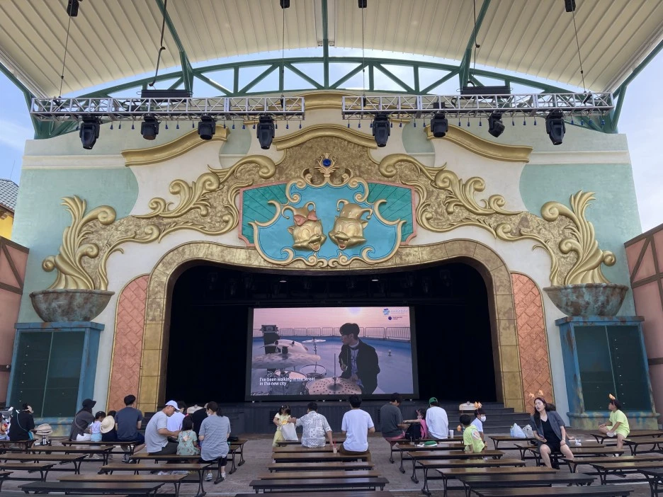 무대커텐에는 공식 롯데월드 어드벤처 부산 로고가 아닌 레거시 엔터테인먼트에서 제작한 파크 로고가 새겨져 있는 모습. 무대는 우천 등 습기를 고려하여 나무데크로 마감된 모습이다.