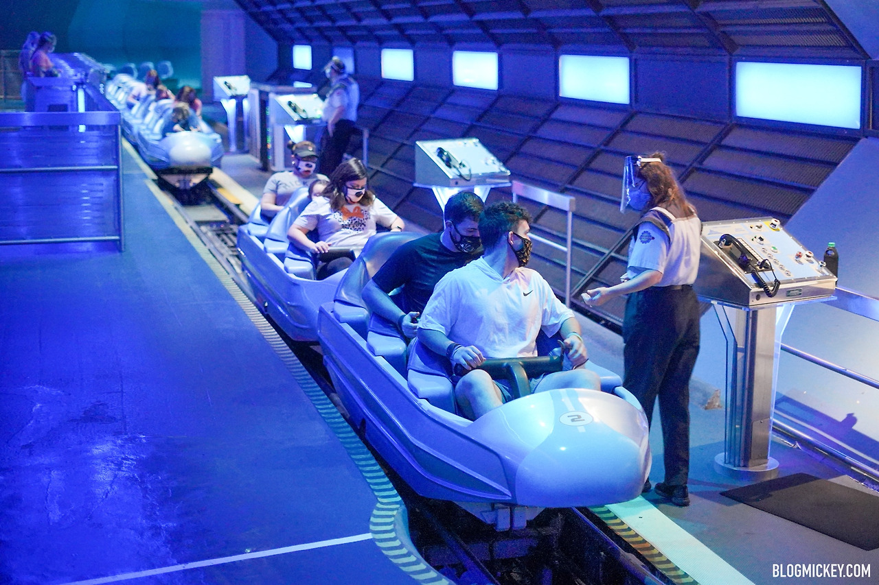 이윽고 스테이션에 도착하면 우리가 탑승할 차량이 보인다. 위에서 언급했듯이 마터호른 봅슬레이 어트랙션의 차량을 본따 만든 디자인이다. 로켓과는 거리가 멀어보이지만 그래도 미래지향적인 디자인에 벨트에서 간편한 안전바로 교체했다는 점, 그리고 차체가 낮기 때문에 운행시 격렬한 움직임과 가속도를 온 몸으로 느낄 수 있다는 장점이 있다.