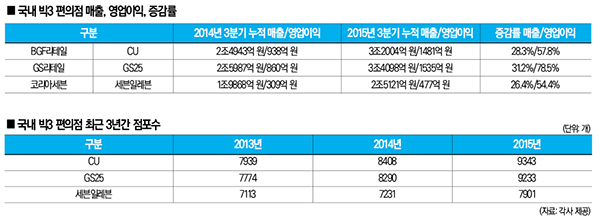 매장수도 크게 늘었다. CU는 지난해 8408개에서 올해 9343개로 935개가 늘었다. GS25는 같은 기간 8290개에서 9233개로 943개, 세븐일레븐은 7231개에서 7901개로 670개가 각각 증가했다. <표 참고>