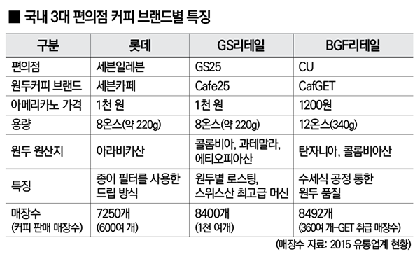 세븐일레븐의 ‘세븐카페’, GS25의 ‘Cafe25’, CU의 ‘카페 겟(Cafe GET)’은 커피전문점과 같은 품질과 1천 원대의 가격을 책정, 소비자들의 반응이 뜨겁다. 테이크아웃 등 소규모 커피전문점 관계자들은 매출 하락을 우려하고 있다.