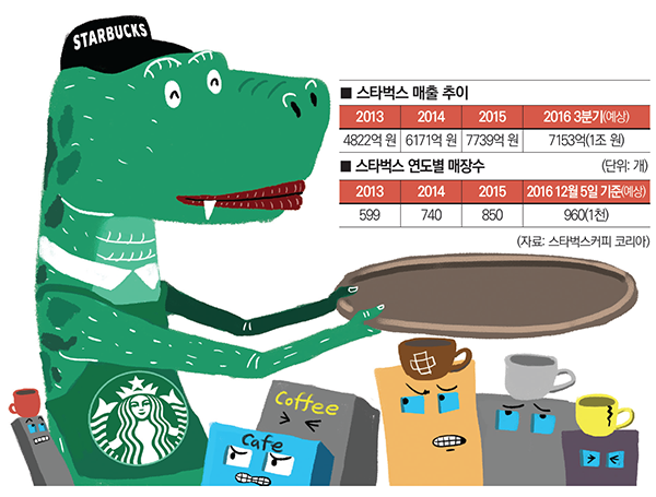 스타벅스커피 코리아(이하 스타벅스)가 공격적인 출점으로 몸집을 키우고 있다. 유동인구가 많은 주요상권은 길 하나를 두고 2~3곳의 매장이 들어서는가 하면 이면도로의 B급상권에서도 이제 손쉽게 스타벅스 매장을 찾아볼 수 있다. 특히 신세계백화점, 이마트, 스타필드 등 자사 유통채널에서의 입점도 무조건적으로 늘리면서 시장을 장악하고 있다.