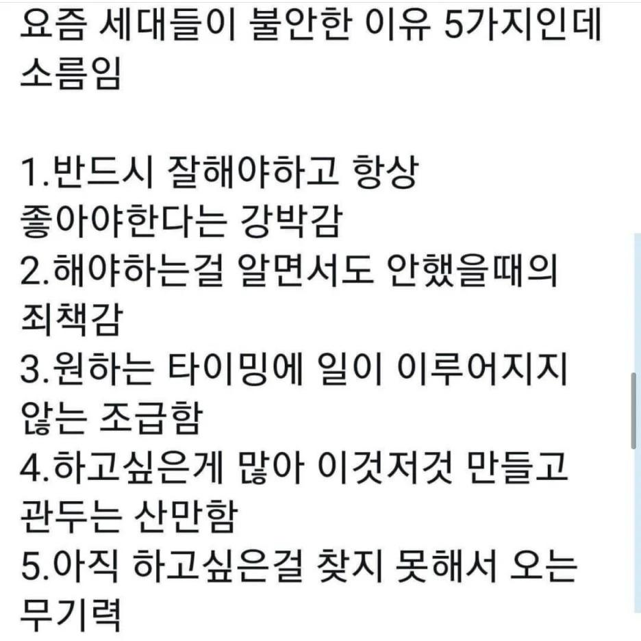 아그레아블에서 요즘 세대가 불안한 이유라는 짤을 공유해주셨는데 이게 딱 요즘 MZ세대들의 심리인 것 같아요. 특히 SNS로 24시간 모두와 연결되어 있으면서 누군가와 비교하는 것이 일상이 되어버린 MZ세대는 겉으로 보기에는 비합리적인 선택을 하지만 그 속을 들여다보면 미래에 대한 막연한 불안함, 나만 뒤쳐질 수 있다는 두려움이 자리 잡고 있어요.
