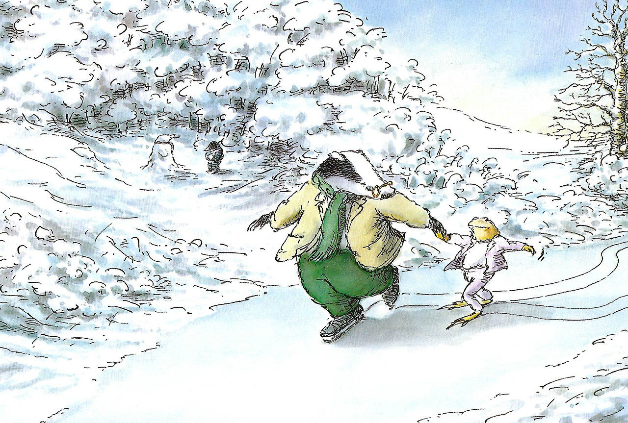 개구리는 얼음 위에서 스케이트로 첫걸음을 떼는 것을 도와준 일