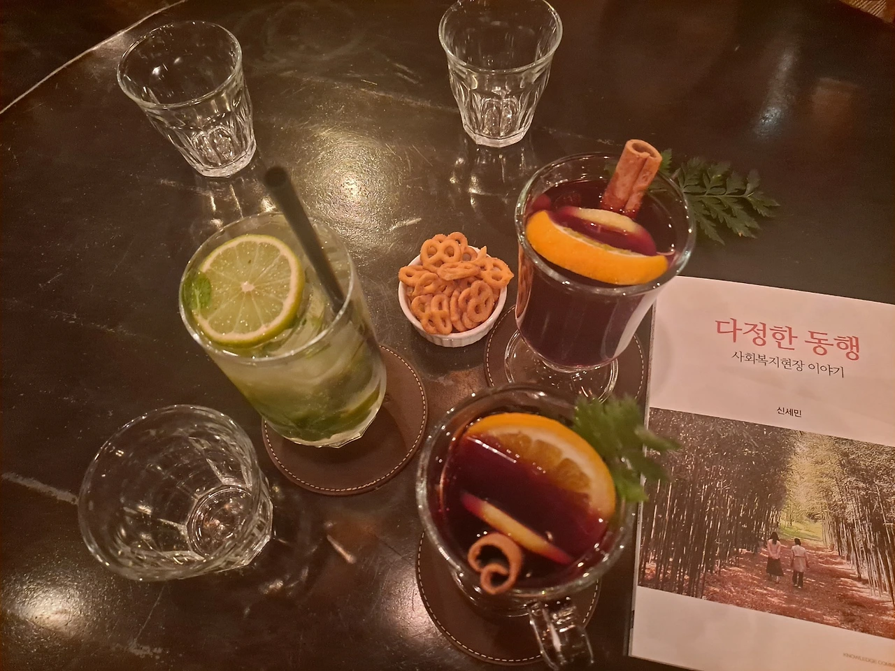 광복동 이재모 피자 뒷편 레귤러하우스를 찾았다. 오랜만의 방문이었지만, 밤에 어울리는 정취가 있다. 체리빛깔 실내, 낡은 캐리어장식, 재즈 음악도 낮게 깔려 두 서너명이 정겹게 얘기하기 딱 좋은 곳이다. 분위기에 어울리게 뱅쇼와 모히또도 곁들였다.