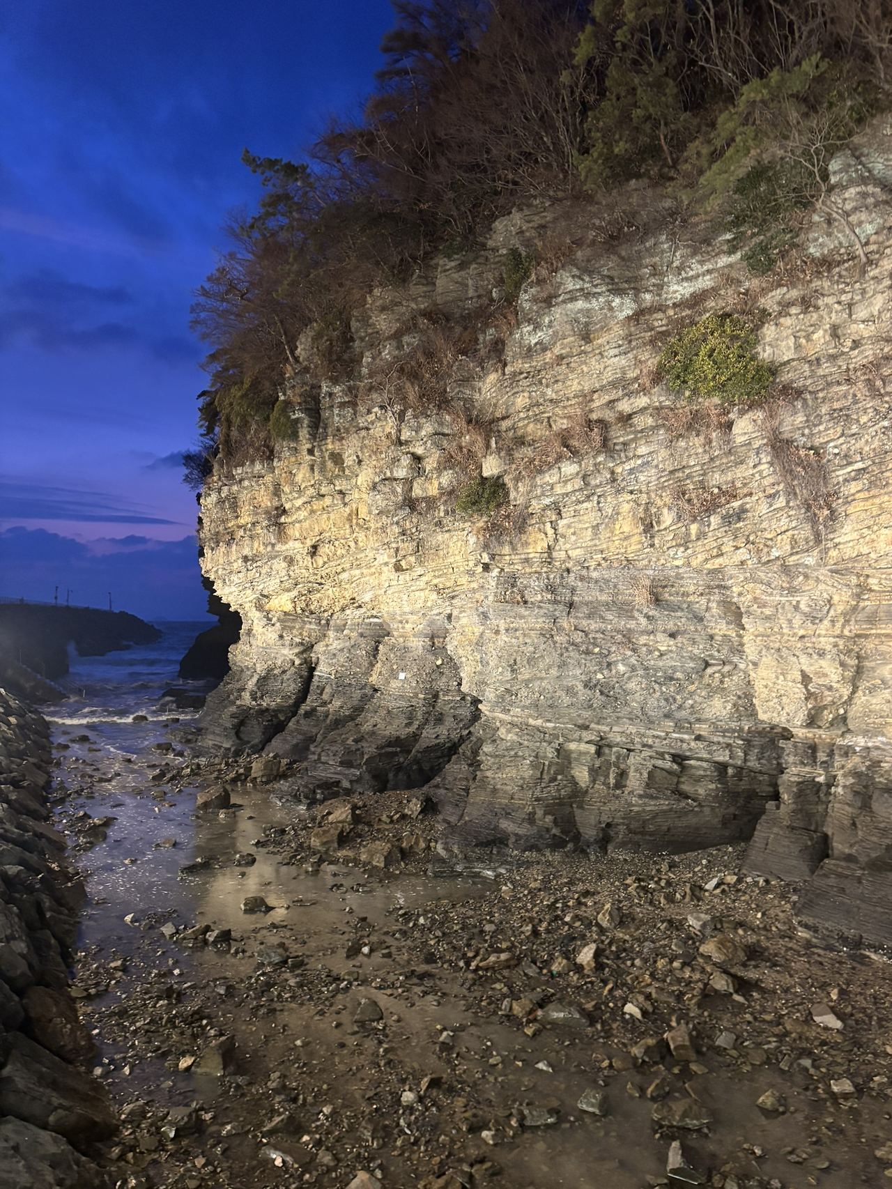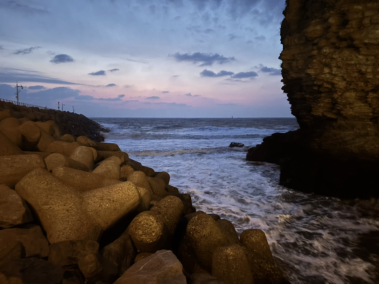 부안의 격포항으로 야간 산책을 나섰다. 불이 다 꺼진 건어물센터를 뒤로 하고 방파제길로 나아가 채석강으로 넘어갔다. 늘상 보던 채석강의 모습은 해수욕장 옆에 넓게 펼쳐진 곳이었다. 그런데 방파제쪽에서 연결된 통로를 따라 간 곳은 물이 들어오는 머리발로 반대편 바다절벽의 모습을 보여주었다. 조명의 화사함과 검은 핑크빛 낙조하늘이 이쁘게도 어울린다.