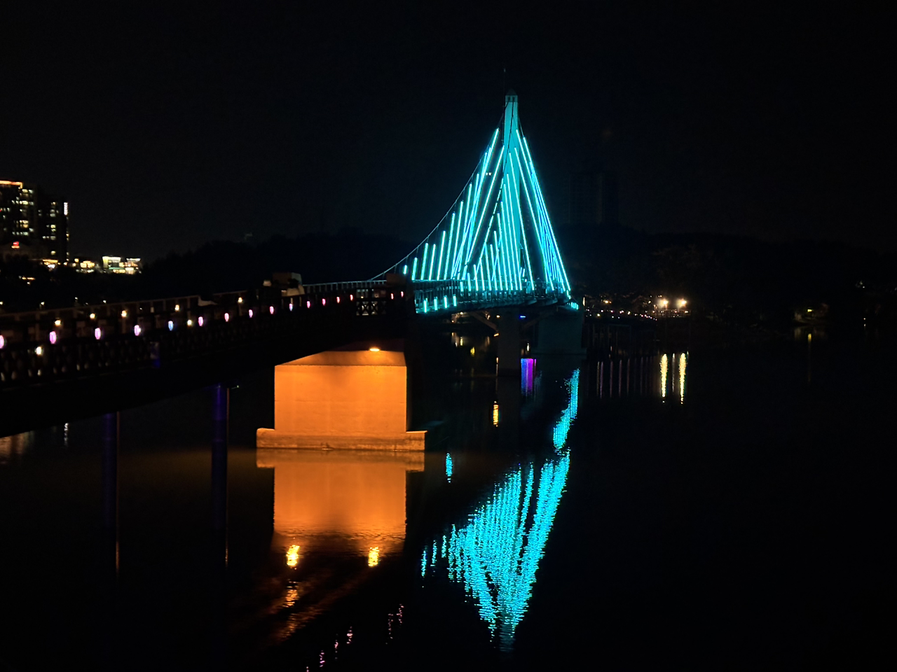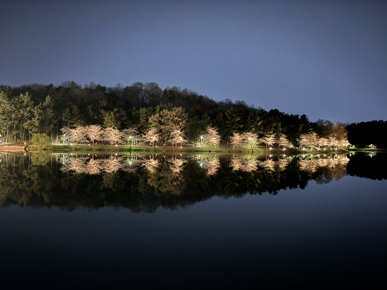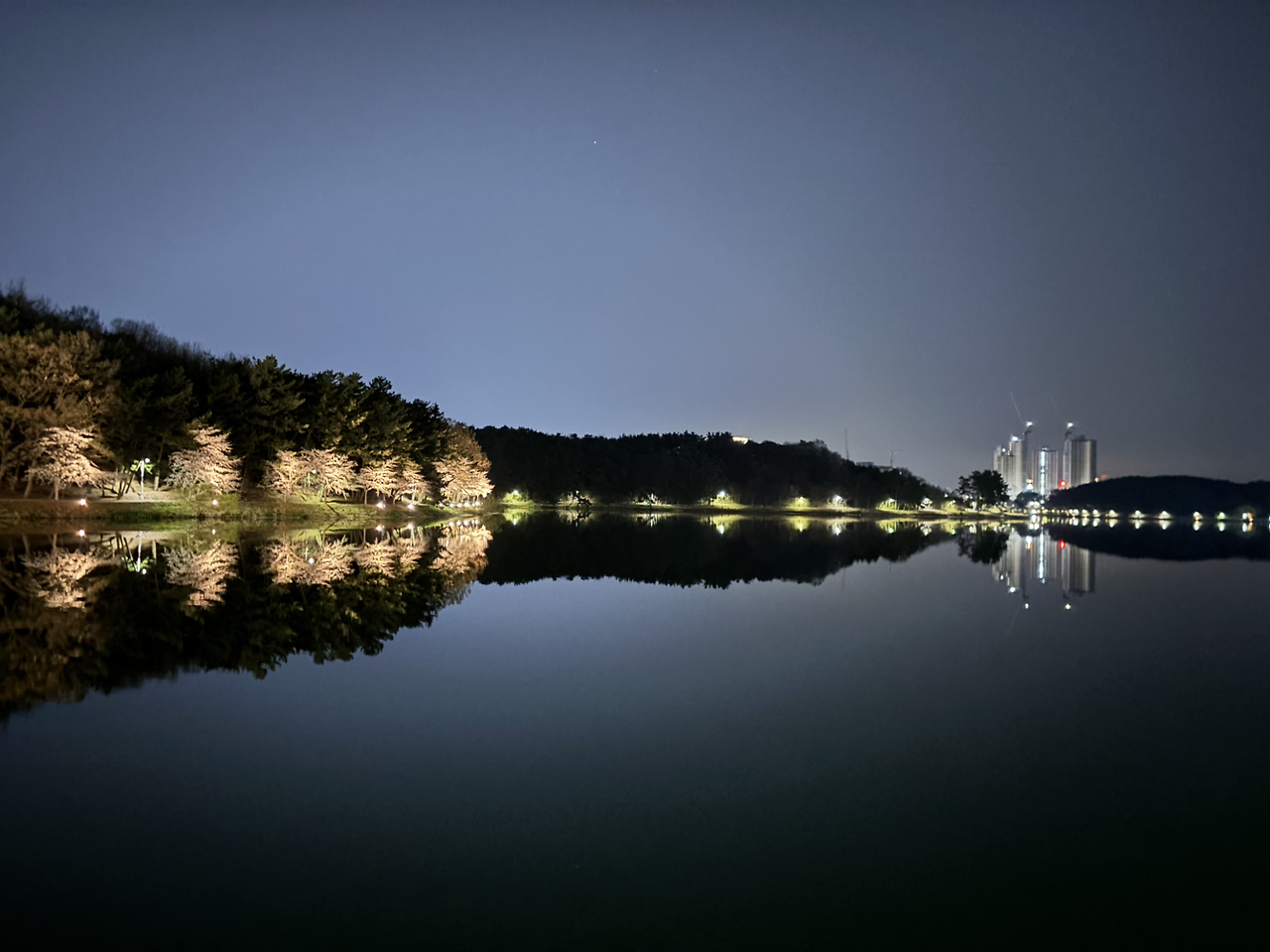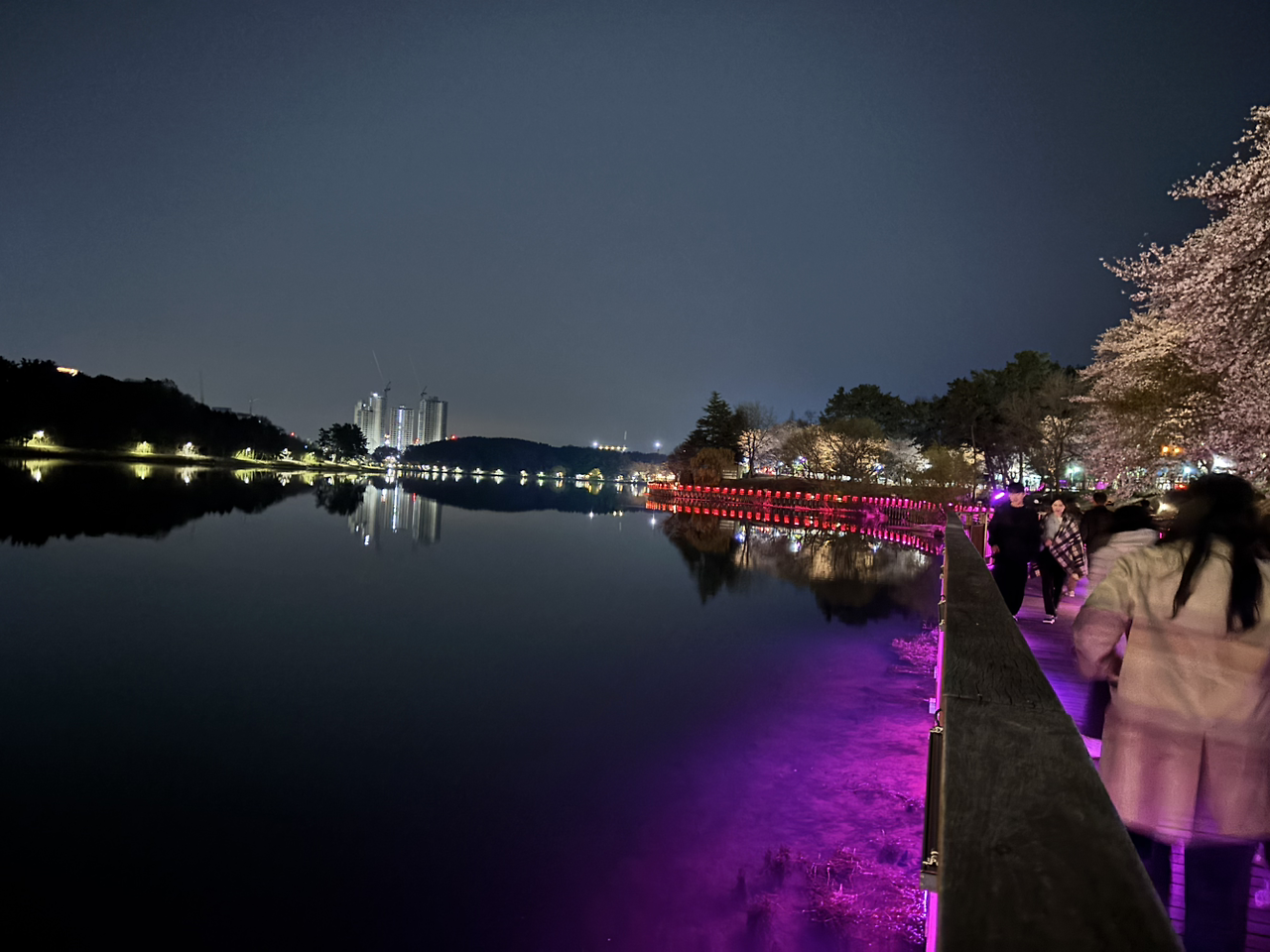 군산 은파호수공원, 해질녘 호수의 물결이 은빛으로 반짝인다는 유래를 말하듯, 4월 벚꽃과 호수에 담긴 공원은 아름답기 그지없다. 벚꽃축제로 사람들의 인파와 멀리 물빛다리의 시시각각 변신하는 색감은 달밤의 정취를 돋운다.