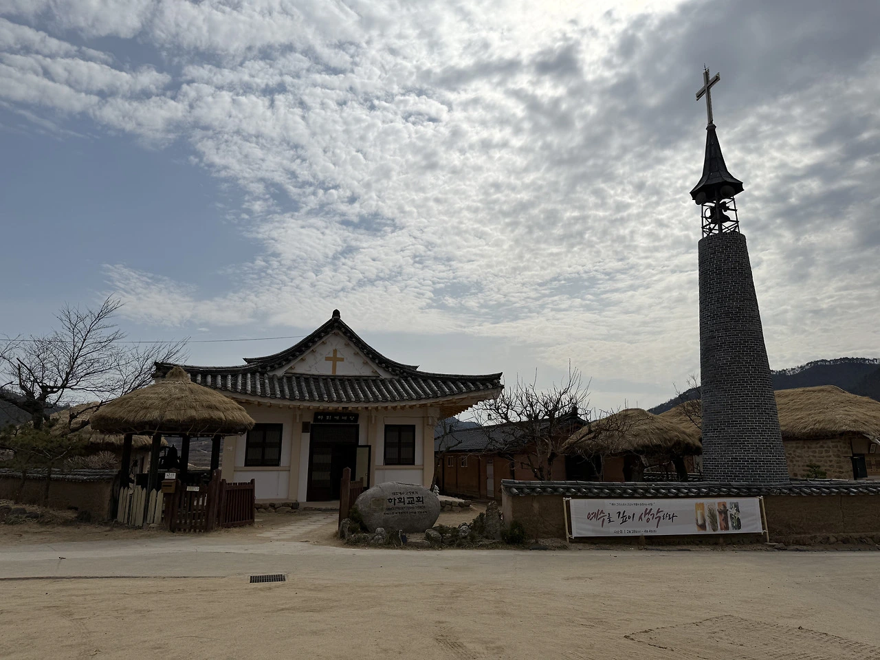 이튿날 하회마을 입구에서 해설사의 안내를 듣고 가는중 하회교회 안내판을 보고 먼저 거기부터 보고자 했다. 시골교회의 고풍스런 멋을 겸비한 장소였다. 자연스레 기도하고 나와 보니 마치 정성스레 만든 돌 기둥 같은 십자가 탑과 종탑이 잘 간직되어 있었다.