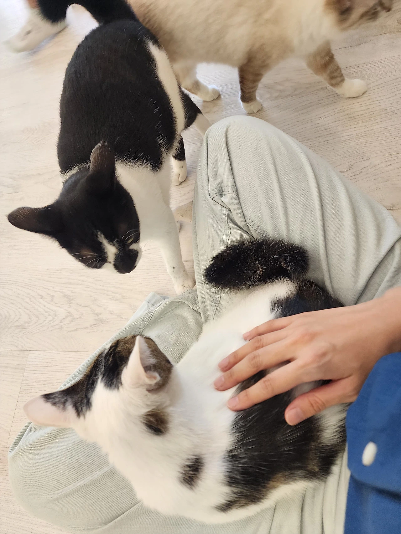 작고 소중한 단 하나의 일정을 잡아놓고 나니, 씻고 집밖으로 나가는 게 조금 귀찮기도 했지만 한편으론 설렜다. 방문한 곳은 2층짜리 단독 건물이었다. 일반 아파트 집처럼 마룻바닥이 펼쳐져있었는데 단지 가구와 방이 없었고, 고양이들이 계단을 왔다 갔다 하며 2층까지 사용하였다. 입구 문을 열고 들어가니 네다섯 마리 고양이들이 일제히 다가와 처음 보는 사람인데도 얼굴을 갖다 대고 부비부비하는 것이 아닌가!