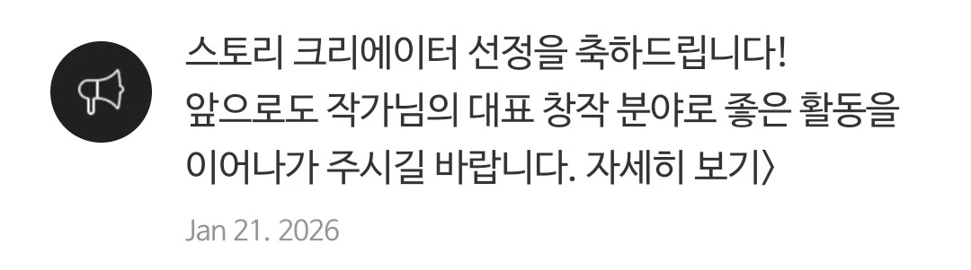 두 번째 성장 일지를 쓰고 1시간도 안 돼서 스토리 크리에이터로 선정이 되었다는 알림이 왔다. 창작 분야에 선정된 걸 보고는 놀랐다. 지금까지 다른 곳에도 연재를 했지만 글을 쓰면서 정식 배지를 받는 건 처음이었기 때문이다.