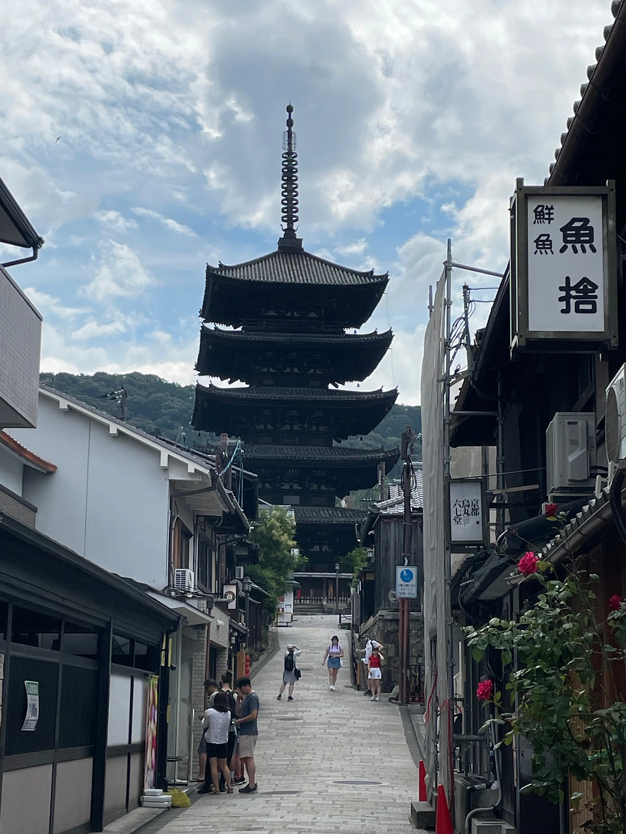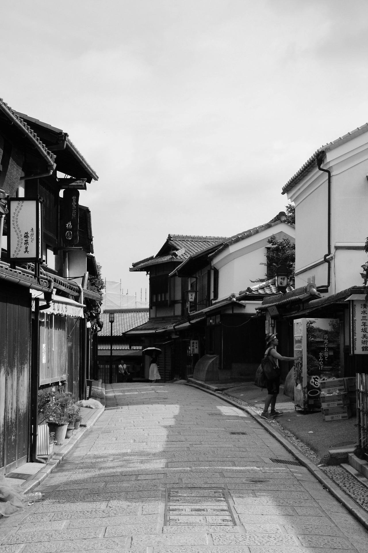 사람이 거의 없는 청수사의 상점 거리를 감상하고 내려가려는 한 청년 하나가 카메라를 들고 기다리고 있었다. 보니 앞에 길을 가고 있는 사람이 지나가기만을 기다리고 있었던 듯했다. 청년은 나에게 먼저 내려가도 좋다는 신호를 주었으나 아무리 빨리 내려간다고 해도 시간이 걸릴 듯해서 괜찮으니 먼저 사진을 찍으라고 몸짓으로 말을 건넸다. 여행지에서는 말보다도 몸짓과 손짓, 표정이 꽤 정확한 의사소통 도구가 되기도 한다. 그 청년도 괜찮다고 지나가시라고 몸짓으로 이야기를 하고 나는 괜찮으니 어서 찍으라고 손짓으로 이야기를 한다. 중국인으로 보이는 청년은 목례를 하며 기다렸다는 듯이 사진을 찍었다. 약 30초 남짓한 시간 동안 우리는 아무 말도 하지 않고 오직 몸짓과 손짓으로만 필요한 이야기를 다 끝냈다. 기다린 김에 나도 사진 한 장을 찍으려는데 저 멀리 현지 어르신이 상자를 들고 오고 계셨다. 떠나는 여행자 그리고 나를 향해 다가오는 현지 어르신의 모습이 꽤 인상적이어서 사진을 찍고 나서 어르신께 사진 한 장 찍었는데 괜찮냐고 ‘몸’으로 여쭈었고 어르신은 노 프라블럼을 외치셨다. 부랴부랴 언덕을 내려가니 그 중국인 청년이 자판기 앞에서 사진을 찍고 물 한 병을 뽑고 있었다.
