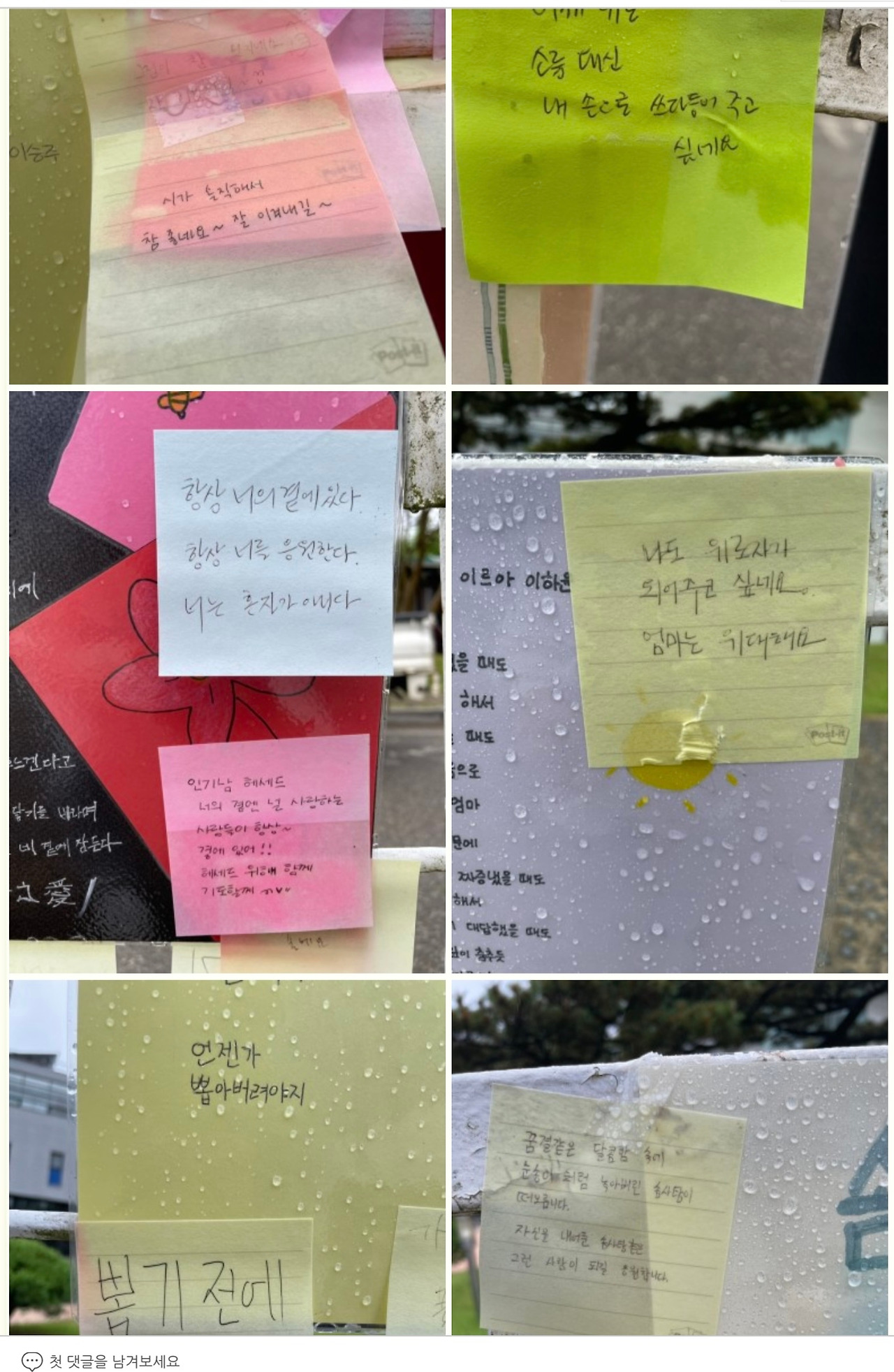 그런데 이 작업이 주는 또 다른 매력은 이러한 상호작용이 또 다른 소통으로 확장된다는 점이다. 선배와 후배들은 물론, 부모님들도 이 소통에 참여해 주신다. 여기에 한 선배 선생님은 시화가 시작되는 곳에 펜과 포스트잇을 잔뜩 가져와 달아 주셨다. 바람이 불 때마다 시화에 달린 알록달록한 댓글 잎사귀들도 함께 말을 걸어오는 듯하다.