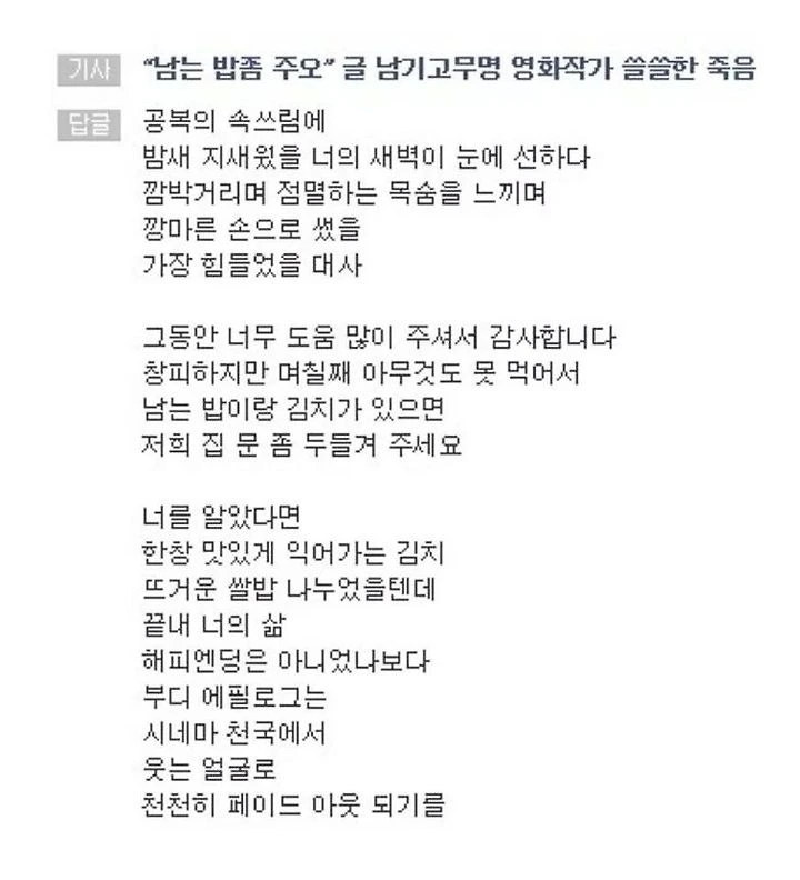 그로부터 수개월이 지난 어느 겨울 나는 또 한 편의 댓글시를 만나게 되었다. 시나리오 작가였던 최고은 작가가 지병과 굶주림으로 요절했다는 기사였다. 예술가는 원래가 가난한 법이라지만 밥이 없이 남는 밥과 김치를 달라는 쪽지를 붙여놓고 결국 세상을 떠났다는 기사에 울화통이 터졌다. 뭐라도 써야겠다 싶어 들어간 댓글창 맨 위에 댓글시가 달려 있었다. 그 시를 읽고 또 멍하니 눈물만 흘렸던 기억이 난다.