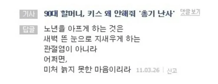 봄이었나. 90대 할머니가 자신에게 키스를 해주지 않는다며 총기를 난사한 해외 기사를 읽고 ‘노망 난 할머니가 미쳤구나. 곱게 늙을 것이지 이 무슨 추태인가.’ 속으로 그렇게 욕을 했었다. 그리고 보게 된 댓글창에는 또 댓글시가 하나 달려 있었다.