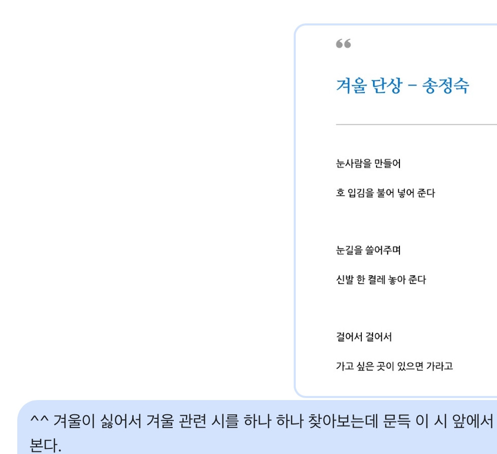 생각해 보니 이번 학기에는 아이들과 시를 많이 감상했던 것이 생각났다. 아이들에게 하고 싶은 이야기가 있을 때에도 내가 좋아하는 시를 소개하면서 이야기를 했던 것이 생각났다. 학기를 시작할 때에도 시를 통해 마음을 나눴고 이번 학기에는 특히, 제페토 시인의 시를 읽고 우리도 댓글시를 창작하며 친구들과 소통하면서 함께 웃기도 하고 눈물을 짓기도 하면서 그렇게 함께했으니.