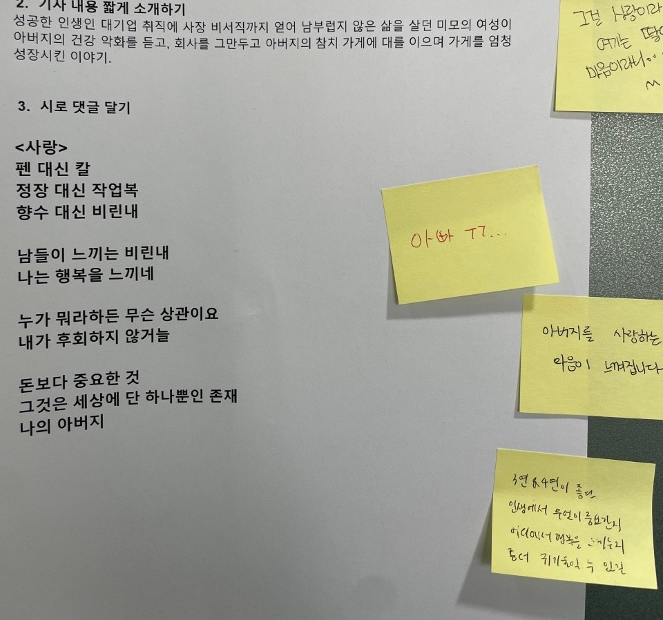 “그냥 친구들이 고른 기사 하나하나가 마음을 건드렸어요. 그 기사를 보고 친구들이 쓴 시를 듣는데 그 시 하나하나가 그냥 다 내 마음을 건드렸던 거 같아요. 제가 고른 기사도 그렇구요.“