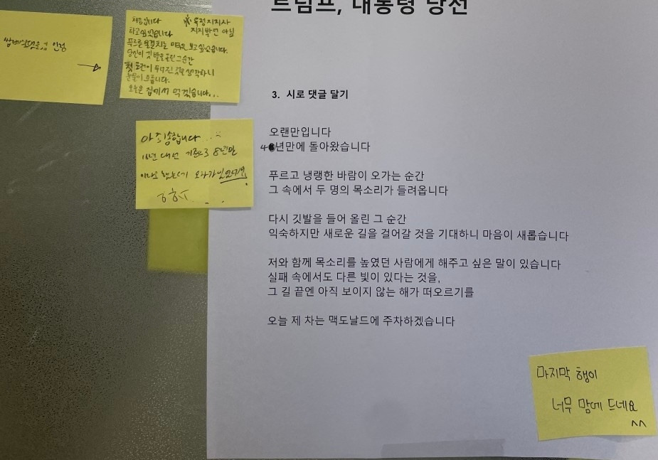 같은 반 아이들의 시뿐만 아니라 다른 반 녀석들의 작품도 감상할 수 있는 시간이다. 침묵하며 친구들의 시와 만난다. 그리고 시와의 만남, 세상과의 만남 이후 느낀 점을 포스트잇에 써서 붙인다. 수업이 진행 중인 다른 교실에 폐가 되어서는 안 되기도 하지만 이 시간은 가급적이면 최소한의 소통만 가능하게 한다. 정말 필요한 순간이 아니라면 친구와의 대화는 최소화하고 혹 할 이야기는 소곤소곤보다 더 작게. ^^ 맨 처음에는 중1 녀석들과 했던 수업이지만 요즘은 고등학생들과 하게 되어 그런지 아이들은 침묵 속에서 작품과 대면하여 만난다. 나 역시 시를 통해 아이들이 바라본 사회를 들여다본다. 그러다가 포스트잇이 떨어질 것 같으면 투명 테이프로 떨어지지 않게 고정하며 다닌다. 가끔은 정치색이 다른 녀석들이 댓글을 통해 우아하게 싸우기도 하는데 그걸 지켜보는 게 여간 재밌는 게 아니다.