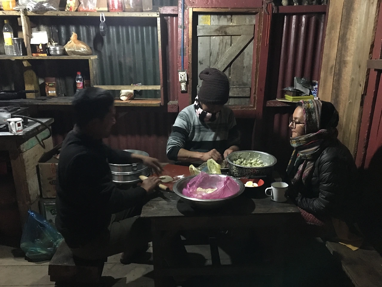 우리는 배정받은 식사를 하기 전 작은 방에 짐을 풀었다. 삐걱대는 나무 바닥에 나무 침대 하나가 덩그러니 있는 것이 다였다. 물론 문도 있고 창문도 있었지만 그것이 전부였다. 어찌 되었든 사방에 벽이 있으니 우리만의 공간이 생겼다. 바람 정도는 막아줄 것이고 사람들도 나빠보이지 않으니 일단은 마음을 진정시키고 부엌으로 향한다. 그들은 잘 훈련된 요리사처럼 분주하게 만두 만들 준비로 바빴다. 단출한 살림은 전등의 약한 불빛 때문에 더 초라해 보였다. 아귀가 맞지 않는 문으로 바람이 불 때마다 차가운 저녁 공기가 들어왔다. 다행히 아궁이에 타는 장작이 열기 덕분에 몸이 노곤해지고 있었다. 우리도 도울 것이 없나 두 팔을 걷어 부치고 도지 곁을 서성인다. 모모는 네팔과 인도 북부 어디서나 쉽게 먹을 수 있는 음식이다. 특히 인도 북부의 모모는 고기를 거의 쓰지 않는 채소 모모가 많다. 몇 가지 재료를 볶고 만두피에 싸서 쪄냈을 뿐인데 한국의 만두보다도 맛있다. 사 먹는 모모도 맛이 일품이었는데 만드는 모모는 더 맛있을 터였다. 길상이와 나는 만두 꽤나 뜯어본 한국인이지만 만들어 본적은 거의 없다. 이들이 준비한 반죽을 가지고 몇 분을 씨름한 후에야 쭈글쭈글한, 그마저도 구멍이 난 모모를 만들어 냈다.