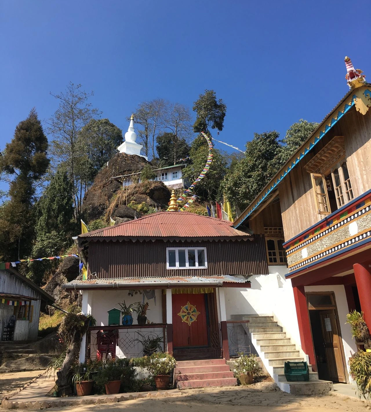 저녁이 되어서야 종점인 마을에 도착해, 수도원이 있는 산 중턱으로 우릴 데려다 줄 트럭을 찾아 나섰다. 산이 아직 끝나지 않았다는 것이 신기할 따름이었다. 상점들이 늘어서 있었지만 손님이라고는 없었다. 한 아저씨의 도움으로 수도원으로 가는 트럭을 얻어 탈 수 있었다. 제대로 된 길은 없었는데 그마저도 사람은 내리고 트럭만 올라가야 하는 숲길이 잦았다. 짐칸에는 곡물 포대와 함께 싣려 진 우리말고도 여자아이 두 명이 더 있었다. 기사의 지시에 따라 트럭에 올랐다 내렸다 하는데 눈치 빠른 아이들은 내려야 할 타이밍에 맞춰 눈썹을 치켜올려줬다. 생김새는 본인들과 너무 닮았는데 현지 말을 못 한다는 것이 이상하다고 생각하는 눈치였다. 사실 다즐링에서부터 사람들의 외모는 우리와 다를 것이 없었다. 실리구리만 해도 눈이 큰 인도 사람들 틈에 스스로 이방인이라 느껴졌는데 다즐링과 림빅의 사람들은 동아시아의 얼굴을 하고 있어 우리가 옆 동네에서 왔다 해도 믿었을 것이다.