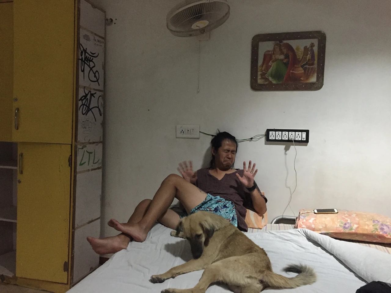 숙소에는 여전히 사람이 없다. 신의 축복도 이곳은 비켜가는 것일까? 관광객이 없는 비수기이니 당연하다 했지만 자이살메르는 관광객으로 넘쳐나고 있었다. 우린 도미토리로 올라가서 잘 준비를 한다. 유일한 냉방기기인 선풍기를 틀었지만 뜨거운 바람만 얼굴을 때린다. 시원해 지기를 아무리 기다려도 소식은 없다. 아침에 만났던 다리가 세 개뿐이던 이 집 개 달걀도 더위에 지친 것인지, 인기척이 그리웠는지 우리 방으로 들어온다. 녀석은 성큼 내 침대 위로 뛰어올라 자리를 잡더니 선풍기 바람을 독차지한다. 뭐 이런 개 같은 경우가 있지? 내가 먼저 자리를 차지하고 있었는데 인도의 개는 장유유서, 질서의식도 없단 말인가! 나도 너무 덥단 말이야! 남편은 질색을 하며 개를 달래며 쫓으려 했지만 요지부동이었다.
