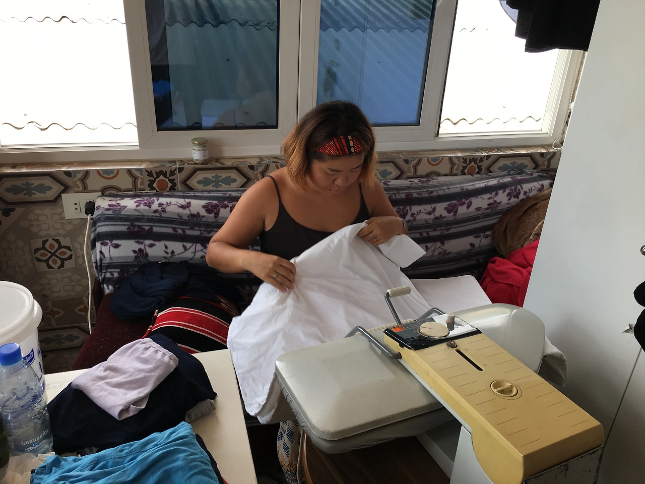 일하는 직원들은 국적이 모두 제 각각이었는데 레바논 이모 두 명은 영어가 전혀 안 통했다. 우리의 말동무가 되어주는 사람은 시리아 출신의 남자 두 명과 방글라데시인 리나, 에티오피아인 야 씨가 다였다. 아마 의사소통이 힘든 이유도 있었지만 늘 바뀌는 봉사자에게 관심을 두는 이는 없었다. 나는 야 씨에게 침대 시트, 이불보, 베개 잎을 다림질하는 법을 배웠다. 큰 와플 기계 같은 기계에 천을 넣고 5초 정도 기다리면 쭈글 했던 면이 반듯하게 펴졌다. 가끔 물을 뿌려 건조한 천이 타지 않게 했다. 반쪽씩 접어가며 다림질을 하고 완성된 천들은 서랍에 차곡차곡 쌓아놓았다. 쉬운 일이라 10분 만에 다림질을 다 배웠다. 히샴 입장에서 이런 일은 정식직원이 하기에는 인건비가 아깝다 생각했을 것이다. 너무 쉬운 일인데도 시간이 많이 걸렸기 때문이다. 나와 같은 뜨내기 봉사자들이 하기에 딱 이었다.