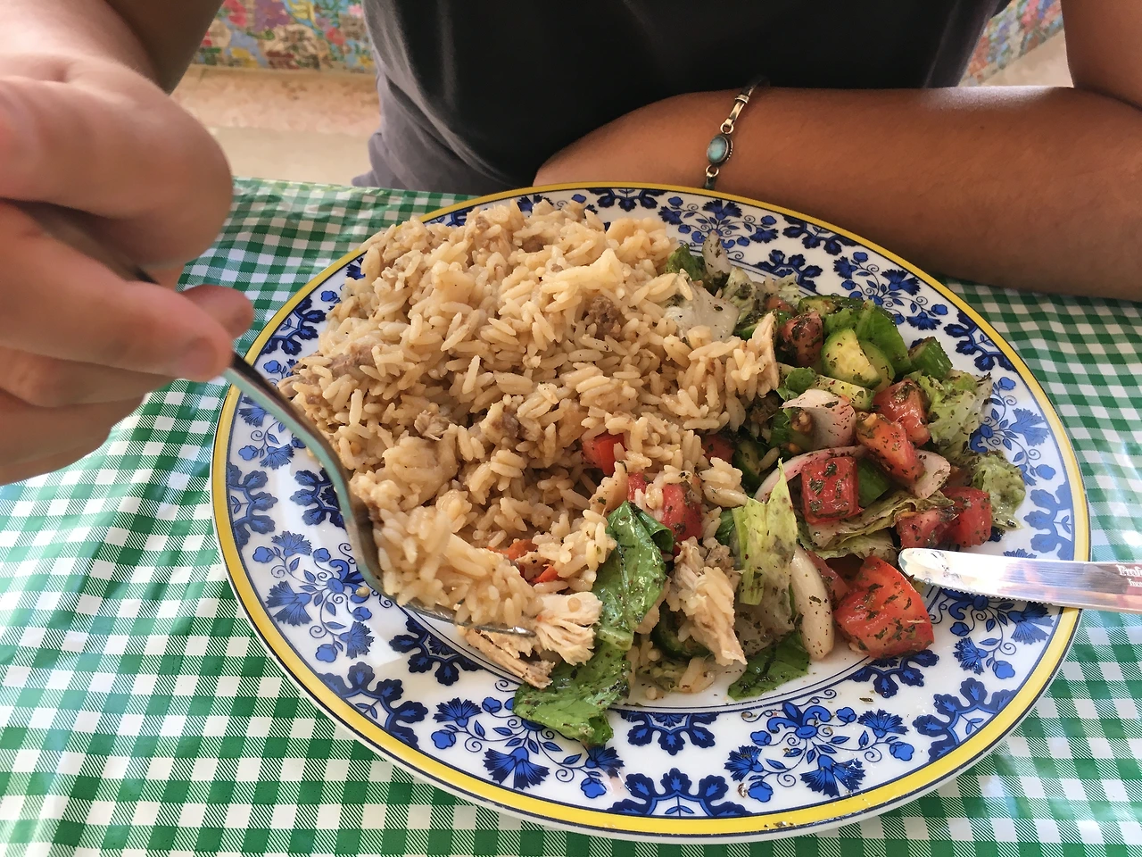 아침은 피타라는 넙적하고 얇은 빵에 오이나, 가지 절임, 요구르트를 넣고 말아 줬다. 슈와르마는 안에 고기나 야채가 훨씬 많이 들어가지만 아침은 가장 간단하게 랩을 먹었다. 랩의 빵은 먹으면 먹을수록 질겼다. 첫날에는 남편과 각자 하나씩을 다 먹었는데 며칠 뒤부터는 하나를 두 개로 나눠달라 했다. 반개씩을 꾸역꾸역 씹어 먹었다. 다 먹고 나면 이가 얼얼할 정도로 질겼다. 점심으로 나오는 음식들은 입맛에 잘 맞았다. 파스타나 쌀에 떡갈비 같은 고기를 양념에 조려 한 접시에 담아 주었다. 하지만 레바논 음식에 한껏 기대했던 것에는 미치지 못하는 평범한 음식이었다.