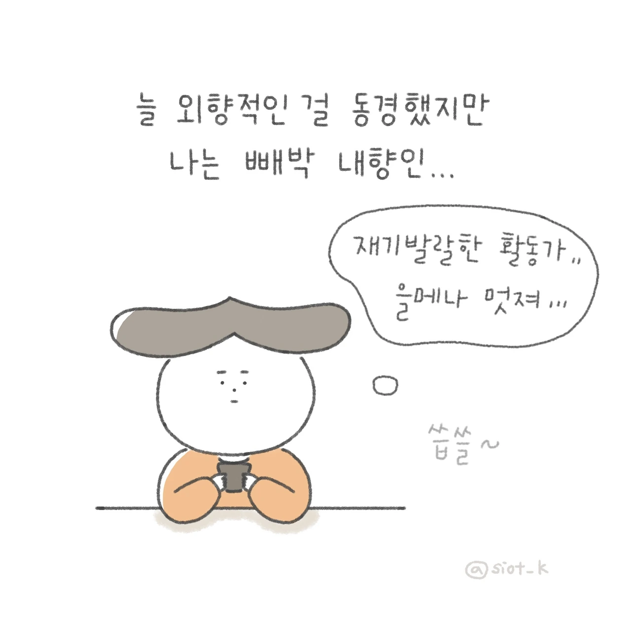 살아온 내내 외향적인 사람들을 동경했다.내가 내향적이고, 소심한 사람이라는 걸 제대로 인정한 건 얼마 되지 않았다.알고 있었지만 이렇게 빼박 내향인으로 증명되고 나니 괜스레 시무룩...그래도 조금은 특별한 내향인인 것으로 위안 삼기로 했다.