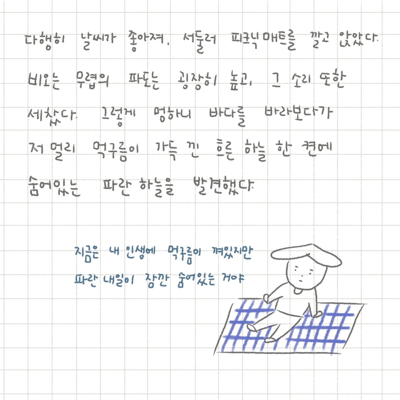 날씨가 잠깐 개었을 때 푸른 하늘과 파도를 볼 수 있었던 것