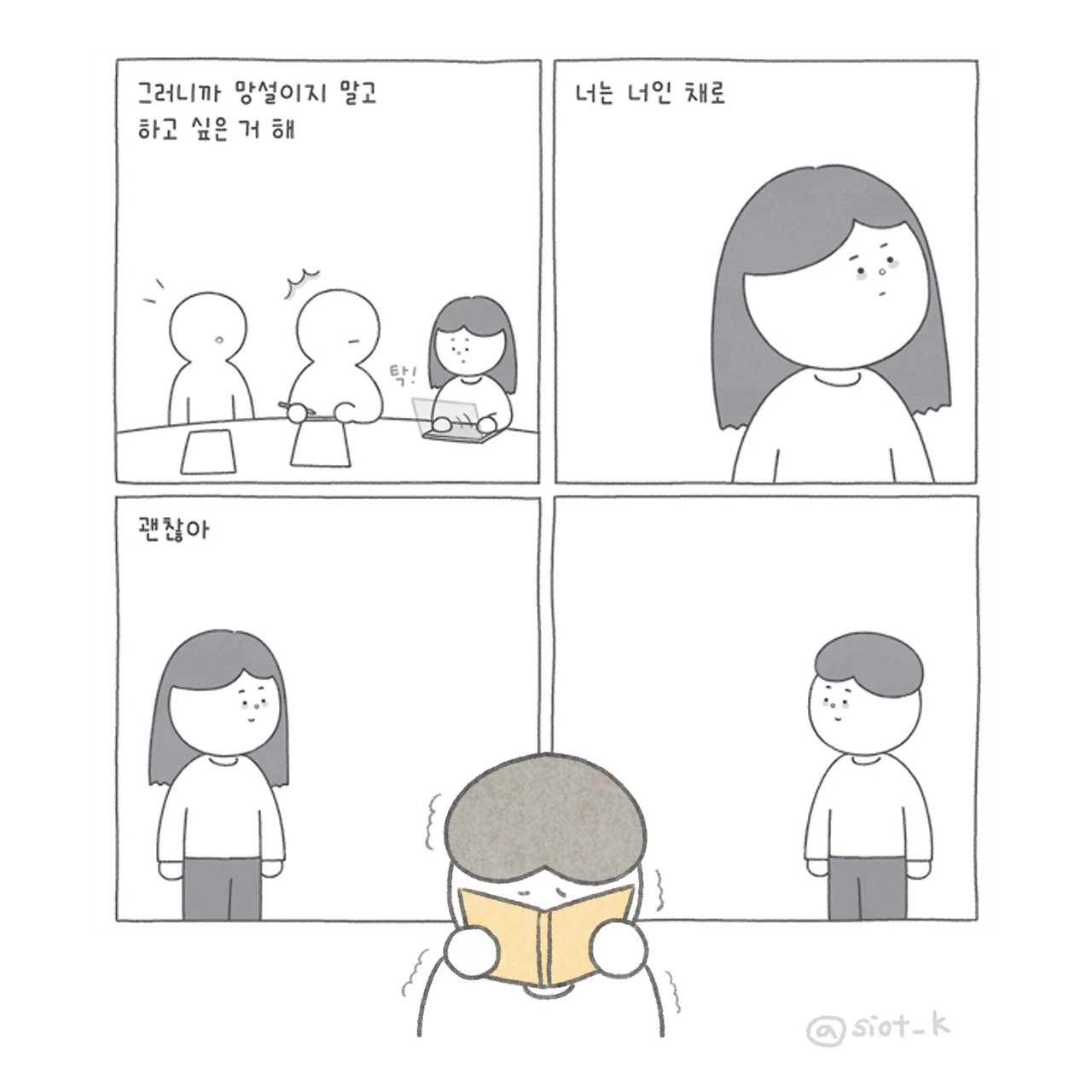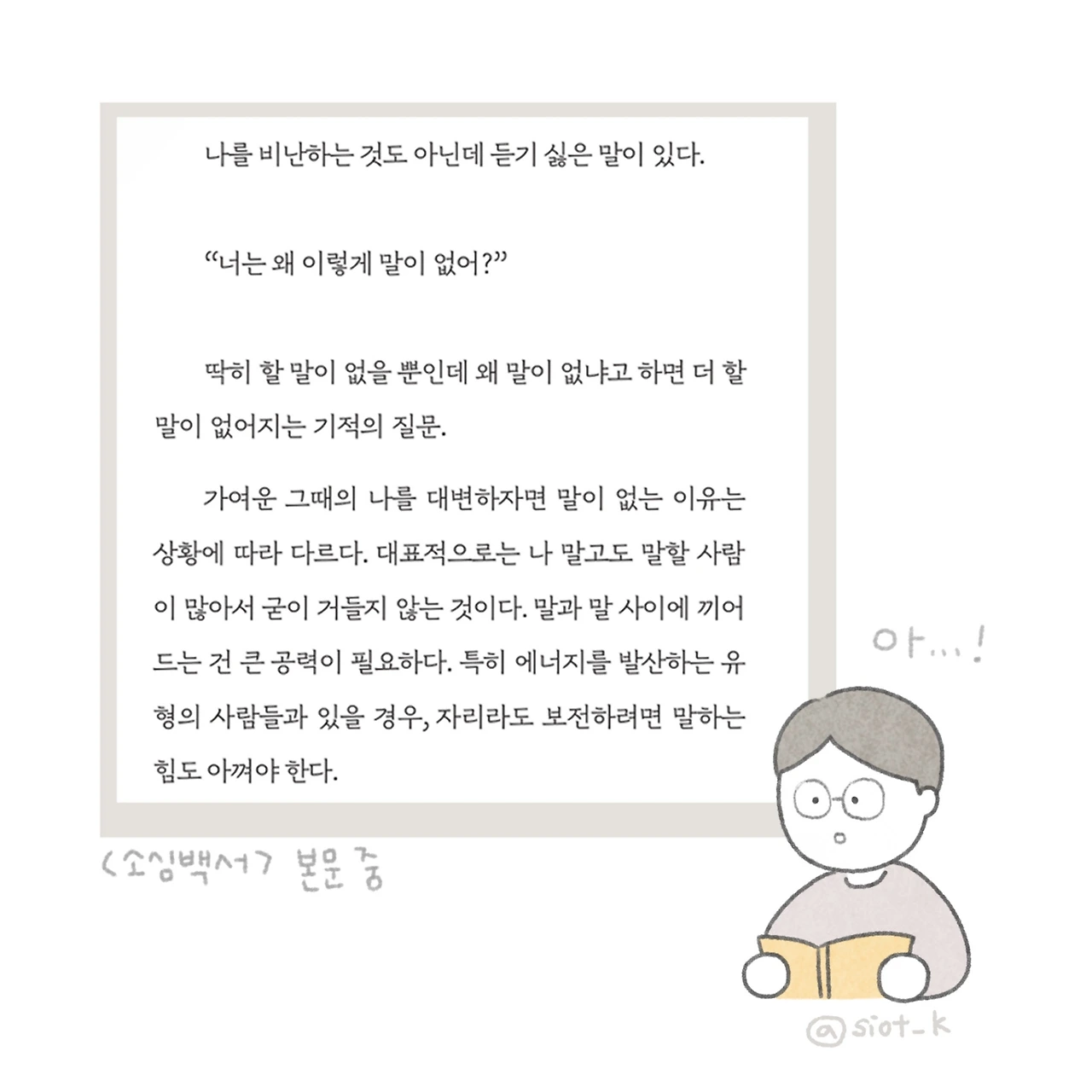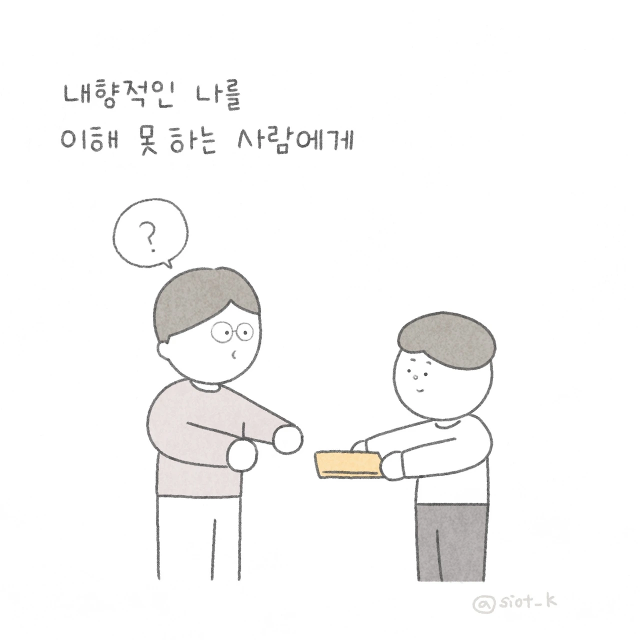 왕내향인인 저는 하고 싶은 이야기를 말로 하는 게 쉽지 않더라고요. 그래서 웬만한 건 꾹 참고, 도저히 안되겠을 땐 문자나 편지를 쓰곤 합니다.