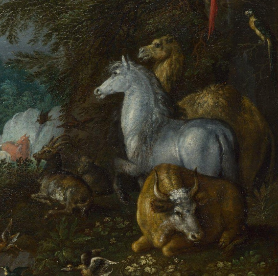 오른쪽 암벽 위에도, 소, 흰 말, 사슴 등 여러 동물들이 등장한다. 낙타, 코끼리 같은 이국적인 동물들도 있어서 장면에 신비로운 매력을 더한다. 새들도 눈에 띄는데 낙타의 머리 위 쪽에는 앵무새 한 쌍이, 언덕 사이의 계곡과 호수 곳곳에도 백조와 오리들이 날개짓을 하고 있다. 잔혹한 맹수와 온순한 가축, 머나먼 이국의 동물들과 각양각색의 새들이 한 자리에 모인 이 작품은 오르페우스의 음악으로 하나가 된 평화로운 낙원의 풍경 그 자체이다.
