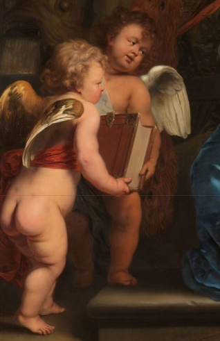 여신 앞에 무릎을 꿇고 있는 소녀는 손에 두꺼운 책을 펼쳐 들고 여신에게 배움을 구하고 있는 것처럼 보인다. 여신은 왼손으로 그런 그녀의 허리를 감싸면서, 둘은 마치 한 몸처럼 연결된다. 아테나 여신에게 딱 붙어서 앉아서 개인 교습을 받고 있는 여인이라니. 세상에서 가장 뛰어난 교육을 받고 있는 것이다. 이 부러운 인물은 당시 암스테르담 최고의 거부였던 트립 가문의 딸 안나 마리아로, 당시 11살이었다. 또한 안나 마리아를 가르치고 있는 아테나 여신은 다름아닌 그녀의 언니 마르가리타이다.