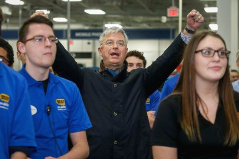 Hubert Joly, the Best Buy chief executive, cheered at an employee gathering before a store in Minnetonka, Minn., opened on Thanksgiving Day in 2015. CreditBruce Kluckhohn/Associated Press