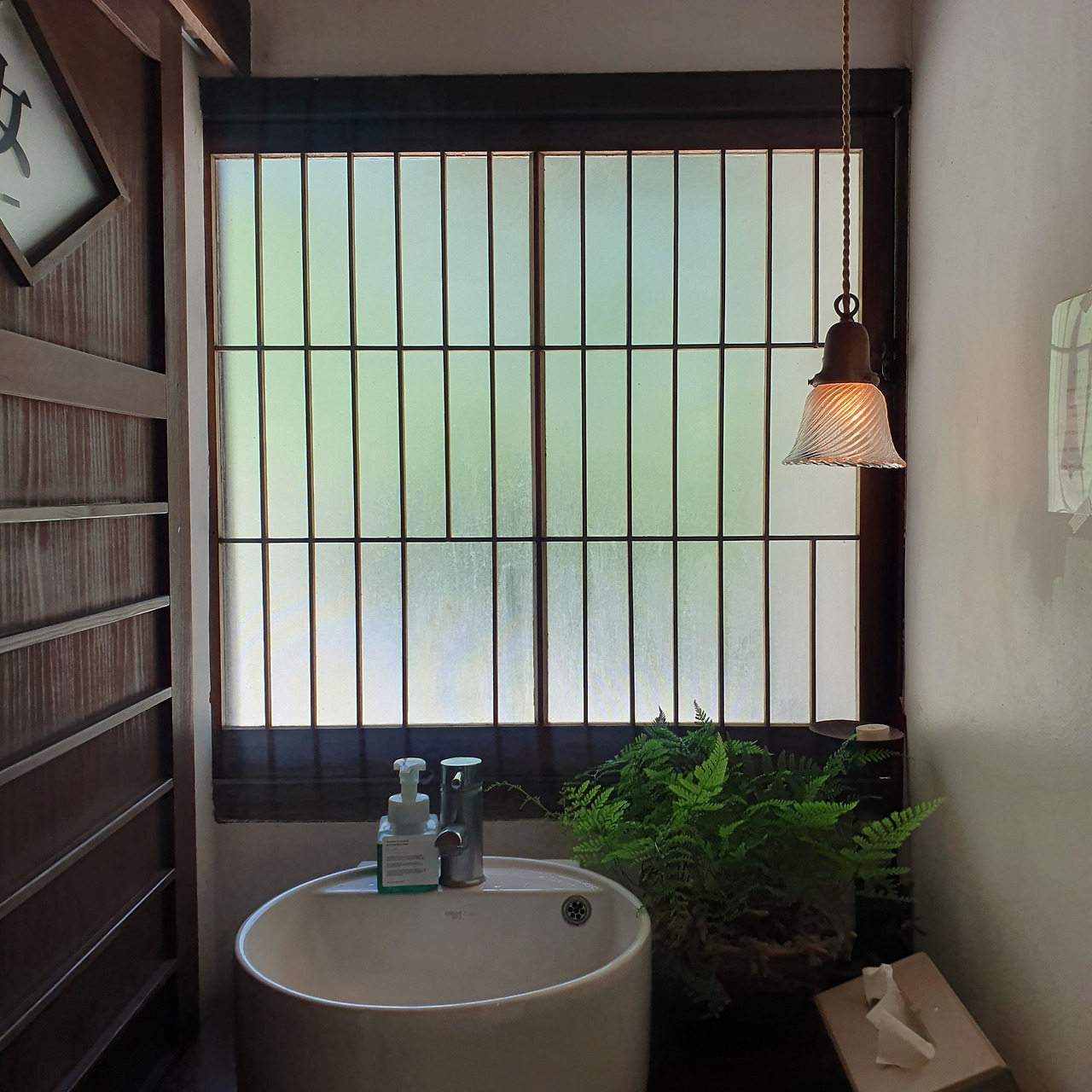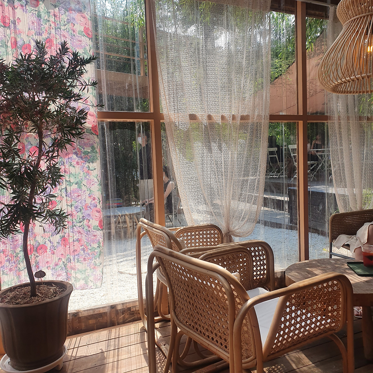 왼쪽의 카페에서는 '빛이 잘 드는 계절에 얇은 시폰소재에 무늬가 있는 커튼을 내 거실에도 달아볼까.' 하는 영감을 받을 수 있고, 오른쪽의 카페에서는 세면대 뒤에 활용한 간살 창문을 북쪽으로 난 내 집 부엌의 작은 창문에도 가져와 볼 수 있다.