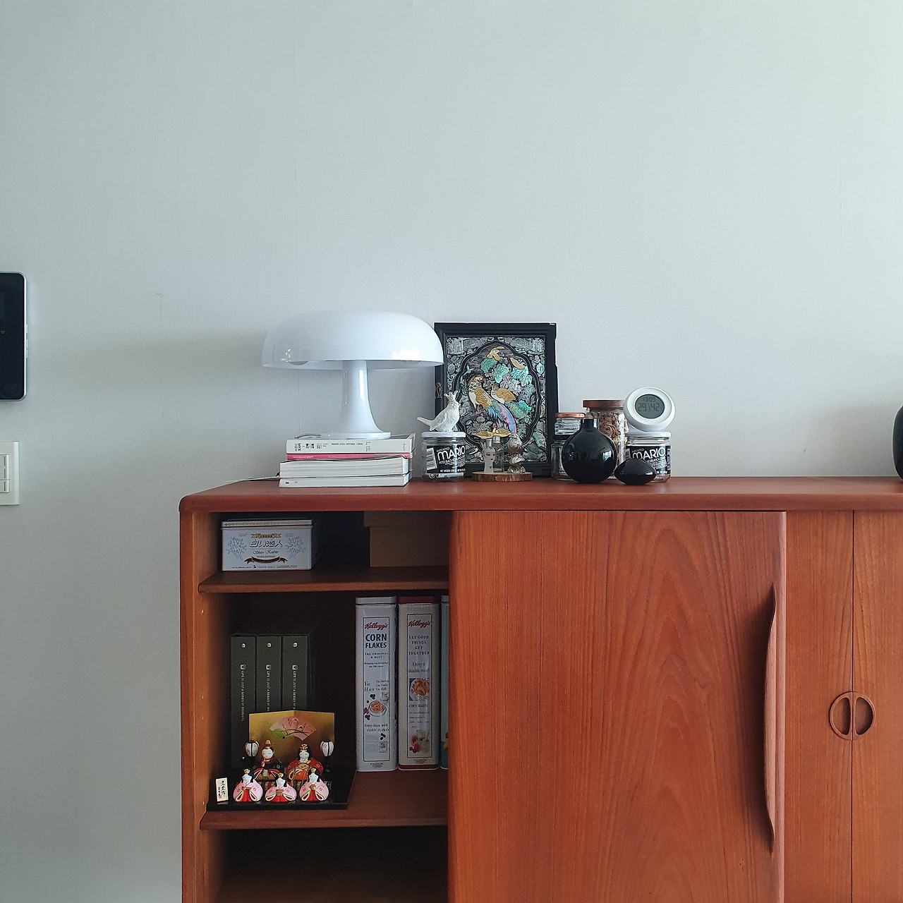 사진은 덴마크에서 전후 시기 생산된 고운 티크목의 거실장 위에 검은색의 자개문짝 하나와 반들한 플라스틱 조명, 그리고 장 안에는 일본 친구가 선물해 준 히나닝교 2) 를 넣어 둔 모습이다. 어째 다 다른 물성과 배경을 갖고 있지만 그 모습이 주는 적당한 균형과 어울림이 참 마음에 든다.