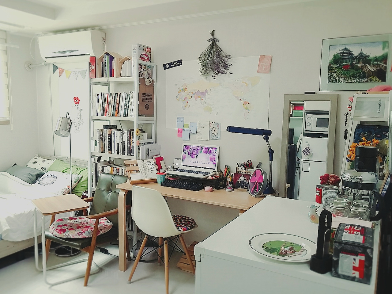 계약면적 5평이 조금 넘는 이 작은 원룸은 사회생활을 시작하고 나서 처음으로 혼자 살게 된 나만의 공간이었다. 내 공간이 주어지자, 나는 밤낮으로 이 집을 어떻게 꾸밀지 고민했다. 외출해 있는 순간에도 많은 짐들을 최적으로 수납할 수 있는 아이디어, 좁은 원룸이기에 더더욱 중요한 공간의 용도 분할과 동선 배치에 대해 생각했다. 포인트를 줄 수 있는 소품과 최대한 작은 가전제품을 정말이지 공을 들여 서치 했다.