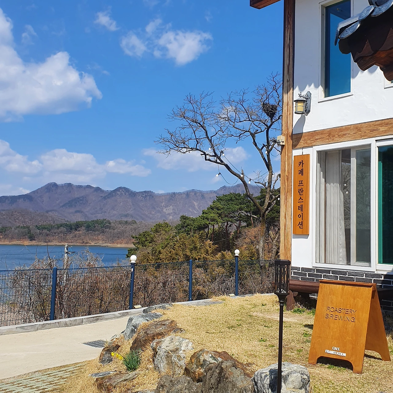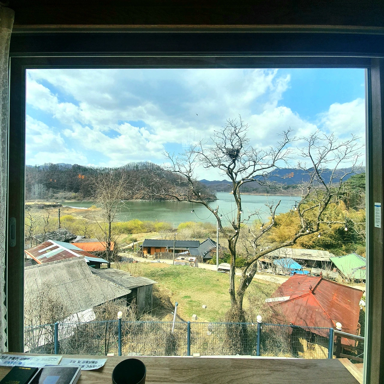 그런데 외롭고 심심했던 아까의 풍경이 카페 건물 안에서 보았을 때는 전혀 다른 모습이 되었다. 색색의 지붕과 조금씩 연둣빛을 띠기 시작한 관목 덤불들의 이른 봄, 파아란 호수와 하늘을 보고 있자니 기가 막힌 풍경화를 감상하는 것 같았다. 바로 이런 순간에 화가는 그 자리에서 종이와 물감을 꺼내고 싶은 욕구가 들겠지. 나는 창가 좌석에 앉아 오랜 시간 풍경을 음미했다. 내가 앉은자리에는 '많은 분들이 사랑해 주시는 자리입니다. 함께하는 배려 부탁드립니다.'라는 안내문구가 적혀 있었지만, 다행히 평일 오전이라서 사람들이 많지 않았다.