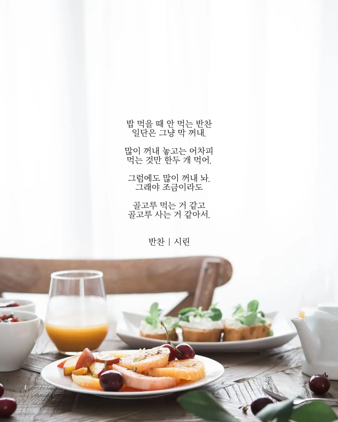 밥 먹을 때 안 먹는 반찬일단은 그냥 막 꺼내.많이 꺼내 놓고는 어차피먹는 것만 한두 개 먹어.그럼에도 많이 꺼내 놔.그래야 조금이라도골고루 먹는 거 같고골고루 사는 거 같아서.반찬 | 시린