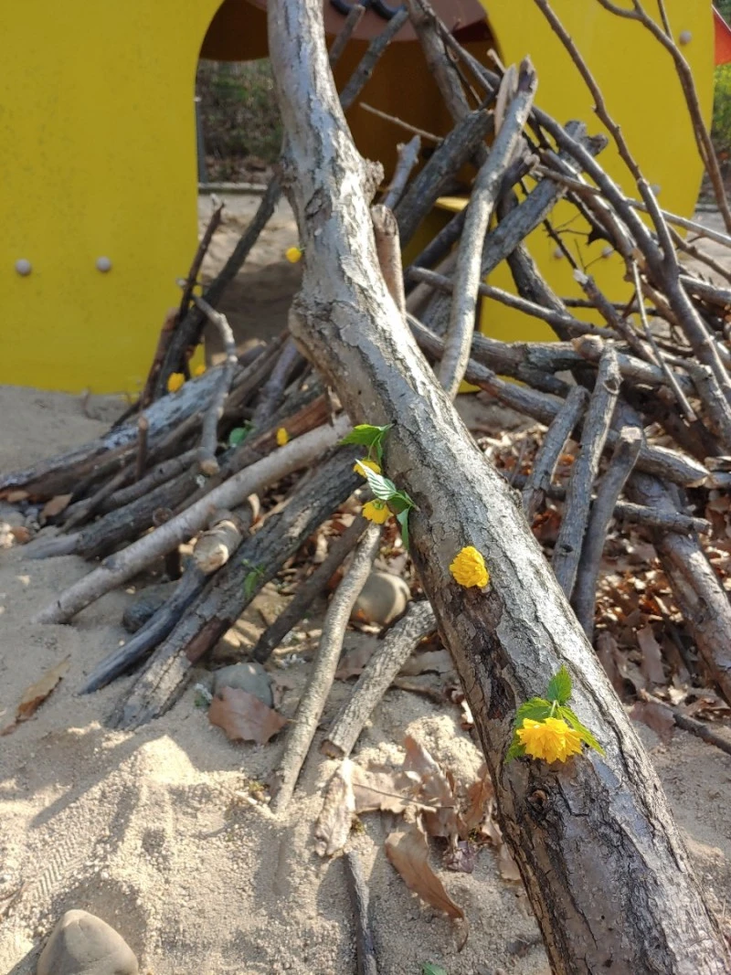 꼭대기 집에서 지대가 완만한 곳으로 이사했지만, 관악산 자락을 아주 뜨진 못했다. 첫째는 초등학생이 되면서 동네 친구들과 집 앞 공원에 모여 놀 때가 많다. 하루는 아이들이 공원에 딸린 모래놀이터 한 구석에 깊은 구덩이를 팠다. 그리고 공원 근처 산자락에서 그러모은 나무 기둥과 가지를 얼기설기 엮어 미니 움막을 지었다.