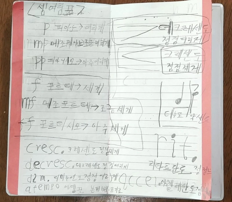네가 맛있게 김치볶음밥을 먹는 동안 엄마는 네 수첩을 힐끗 봤어. 그래, 네가 그린 셈여림포엔 메조포르테(mf)도 있고 포르테(f)도 있고 포르테시모(ff)도 있더라. 그런데 수첩 한편에 크레센도(cresc.)도 눈에 띄던걸.